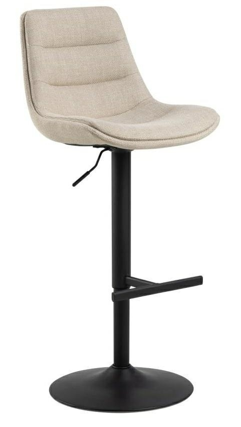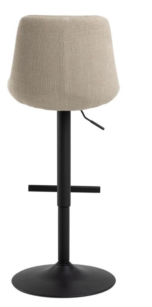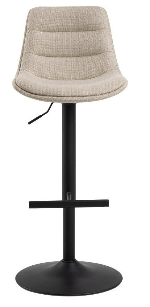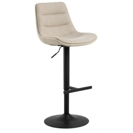 Hoker Adisa je moderní barová stolička na jedné černé noze zakončené kulatou základnou. Barová židle je vybavena kovovou opěrkou na nohy, která usnadňuje jak sezení na stoličce, tak i oporu nohou během sezení. Stolička vyrobená z kovu, desky MDF potažené silnou čalounickou pěnou a látkou Basel beige 24. Tkanina s hrubou vazbou se osvědčí v interiérech s přírodním vzhledem, např. japandi. Výška opěradla: 30 cm, Šířka sedáku: 46 cm, Hloubka sedáku: 38 cm, Maximální výška sedáku. 86 cm, Výška sedadla min. 65 cm Max. zatížení 120 kg. Rozměry kartonu: 57x55x50 cm. Hmotnost: 10 kg. Stolička vyžaduje montáž.