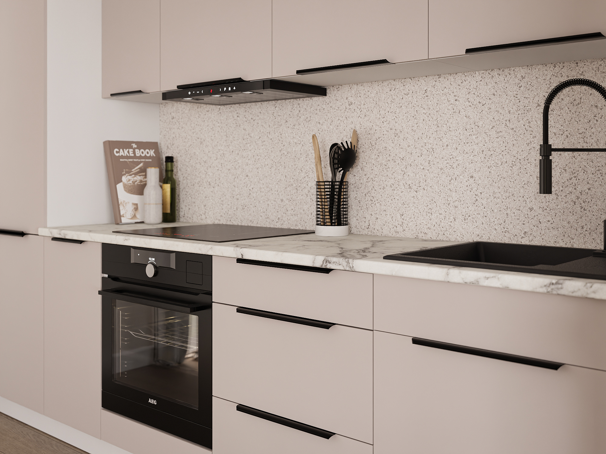 Dvířka a čela šuplíků jsou vyrobeny z laminátových desek vysoké kvality o tloušťce 16 mm v elegantní barvě kašmír. Jsou opatřena ABS hranami, které zvyšují jejich odolnost a přispívají k celkovému luxusnímu vzhledu.