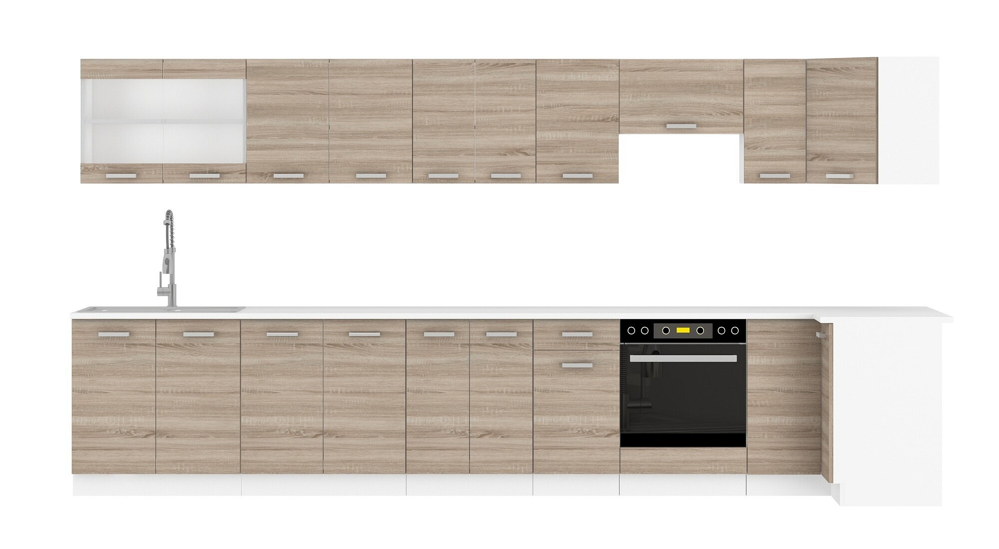 Kuchyně je navržena v atraktivním barevném provedení, které kombinuje bílou barvu s dekorem Dub Sonoma Trufla. Tento kontrast vytváří moderní a svěží vzhled, který se hodí do jakéhokoliv interiéru. Bílý korpus skříňky je vyroben z laminované desky o tloušťce 16 mm, což zajišťuje její pevnost a odolnost. Dvířka a čela šuplíků jsou z kvalitní laminované desky v barvě Dub Sonoma Trufla, což dodává skříňce přírodní a teplý vzhled.