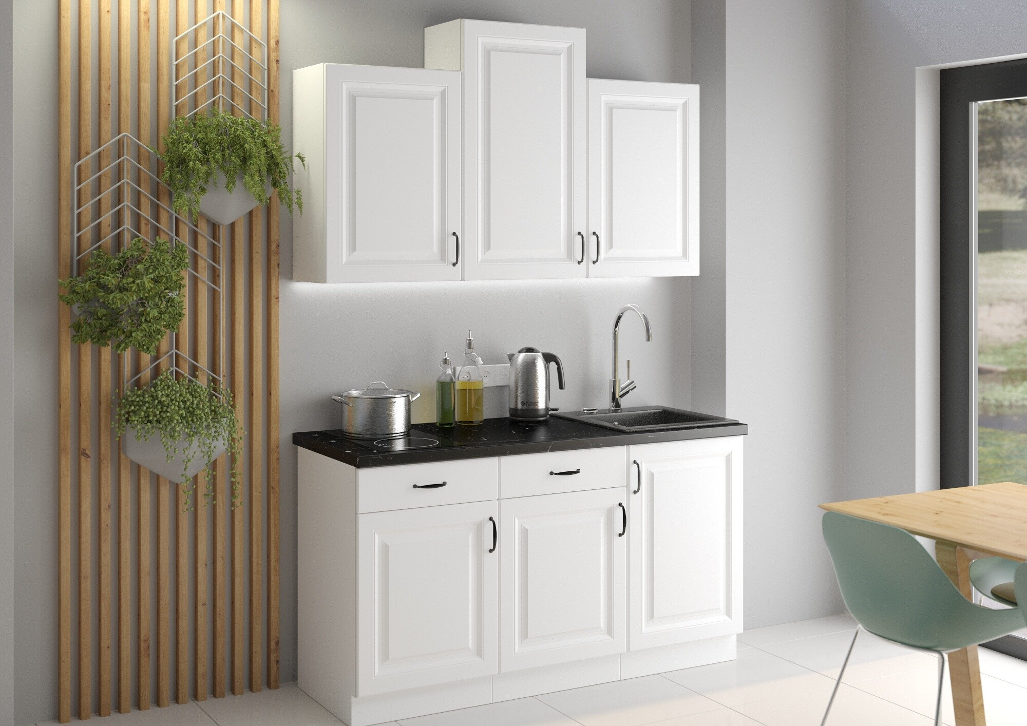 - Dvířka a čela šuplíků jsou vyrobeny z MDF 16 mm v bílé barvě. Skla o tloušťce 4 mm pokud jsou v dvířkách jsou broušené ze všech stran