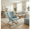 Houpací křeslo v modrém provedení je potažené prémiovou látkou, která nabízí příjemný dotek a snadnou údržbu. Sedák a opěradlo jsou ergonomicky tvarované pro pohodlné sezení, doplněné o pevné čalouněné područky. Stabilní nohy jsou vyrobeny z masivního kaučukovníku a doplněny o černý kovový rám, který zajišťuje pevnost a dlouhou životnost. Houpací mechanismus umožňuje plynulé houpání, které přispívá k relaxaci a odpočinku. Křeslo je určeno pro interiéry s důrazem na komfort a styl, jeho rozměry a nosnost odpovídají běžným standardům pro houpací křesla.