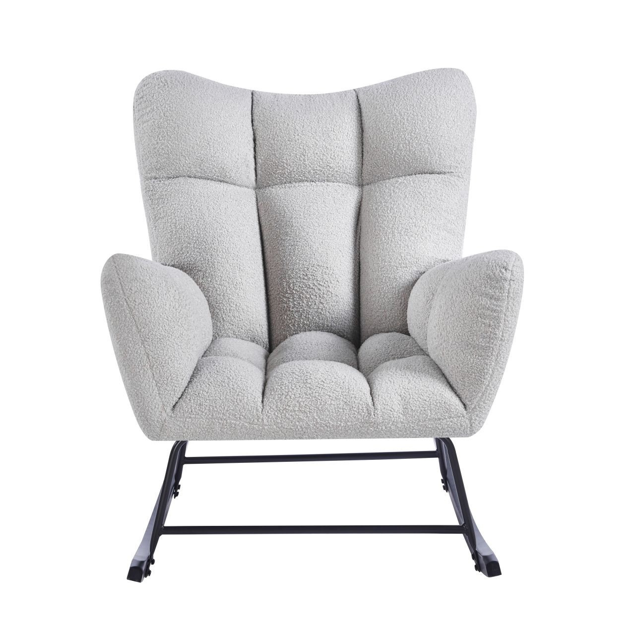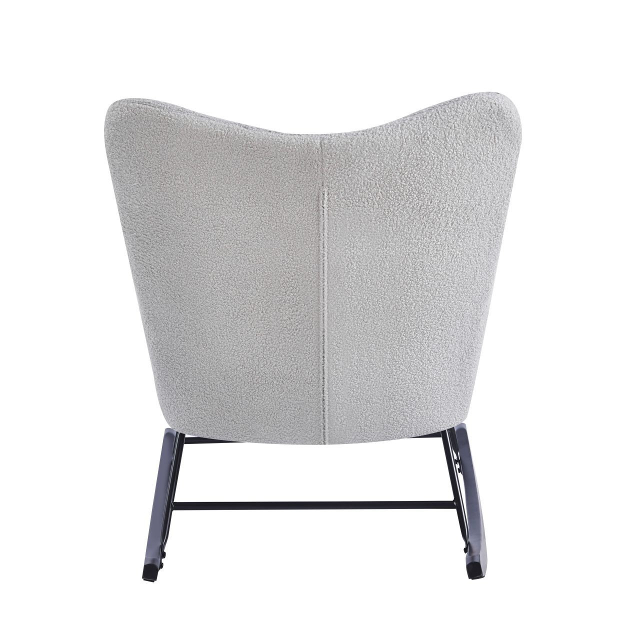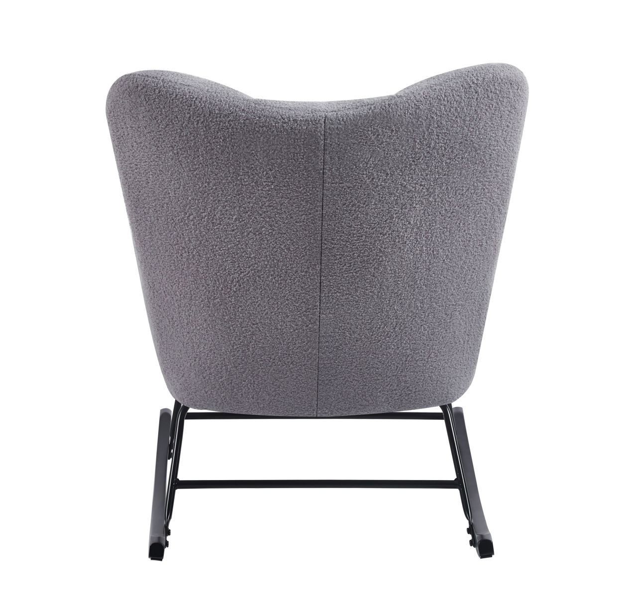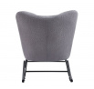 Rozměry: - celková výška: 96 cm - výška sedáku: 46 cm - celková šířka: 78 cm - celková hloubka: 92 cm Materiál - sedák: látka Teddy (Boucle) - rám: kov lakovaný práškovou barvou - lyžiny: kaučukové dřevo Barva: - sedák: šedá - rám + lyžiny: černá