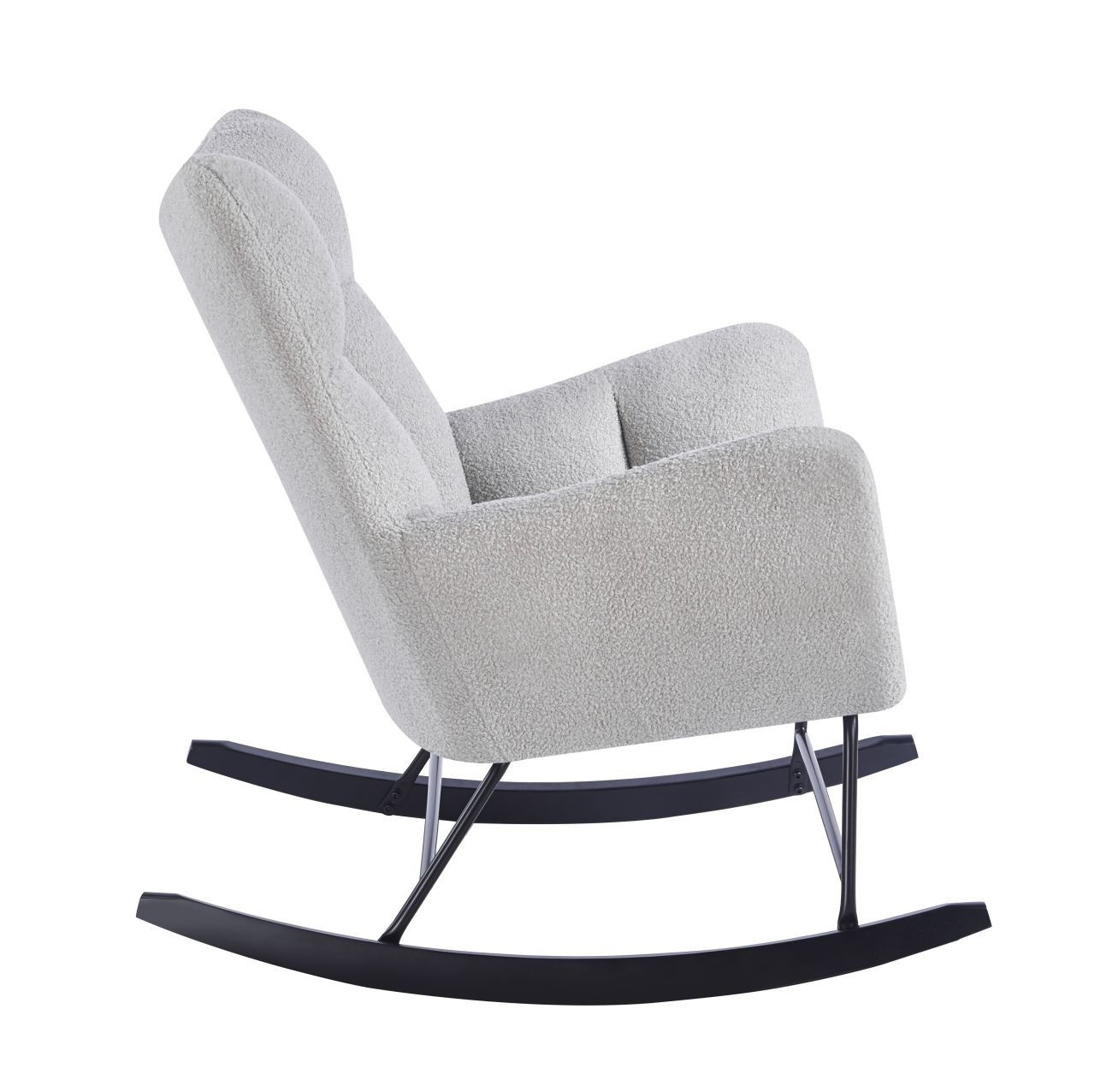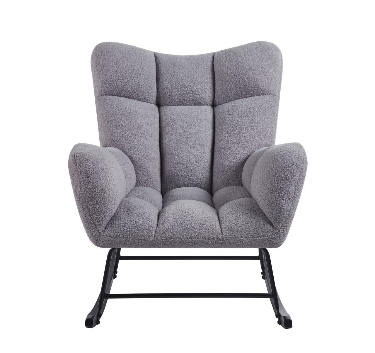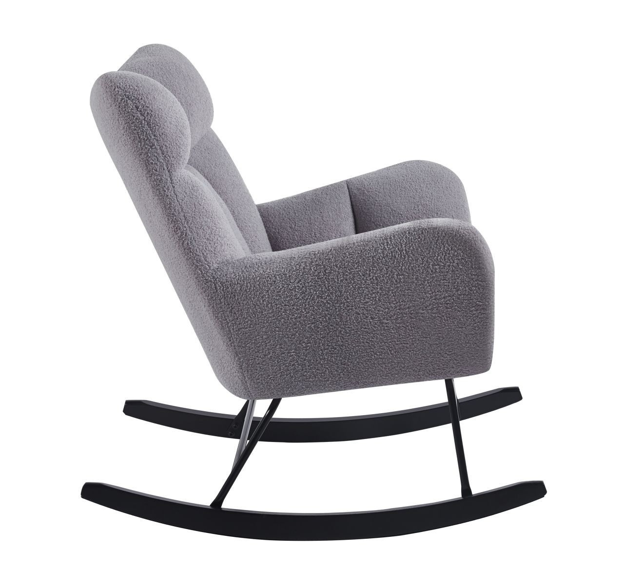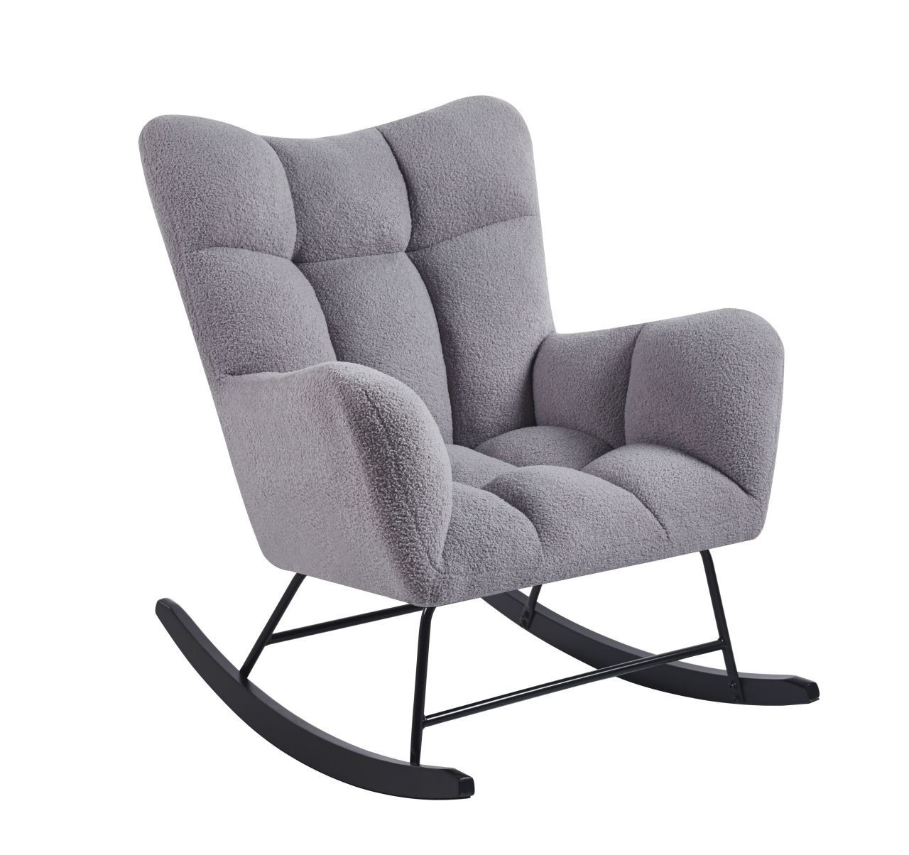 Rozměry: - celková výška: 96 cm - výška sedáku: 46 cm - celková šířka: 78 cm - celková hloubka: 92 cm Materiál - sedák: látka Teddy (Boucle) - rám: kov lakovaný práškovou barvou - lyžiny: kaučukové dřevo Barva: - sedák: šedá - rám + lyžiny: černá