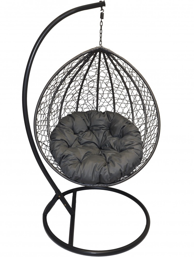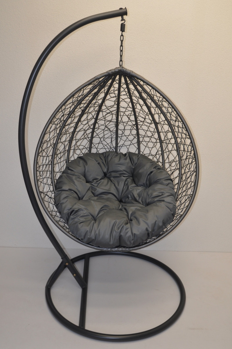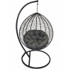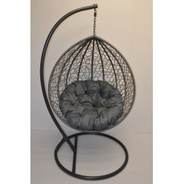 Závěsná houpačka s kovovou konstrukcí a výpletem z umělého ratanu. Součástí je nadýchaný polštář v šedé barvě potahové látky a také masivní závěsná konstrukce sloužící k zavěšení houpačky. | Závěsná konstrukce je vyrobena z masivních ocelových trubek. Průměr základny je 105 cm a výška je 195 cm. Závěsný sedák má velikost 105x72x120 cm. Nosnost houpačky je 110 kg. Houpačka je vypletena z umělého ratanu, který je odolný proti povětrnostním vlivům. Houpačka je tedy určena i pro venkovní použití.