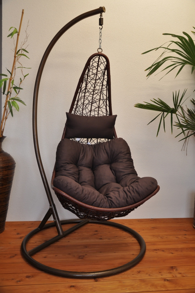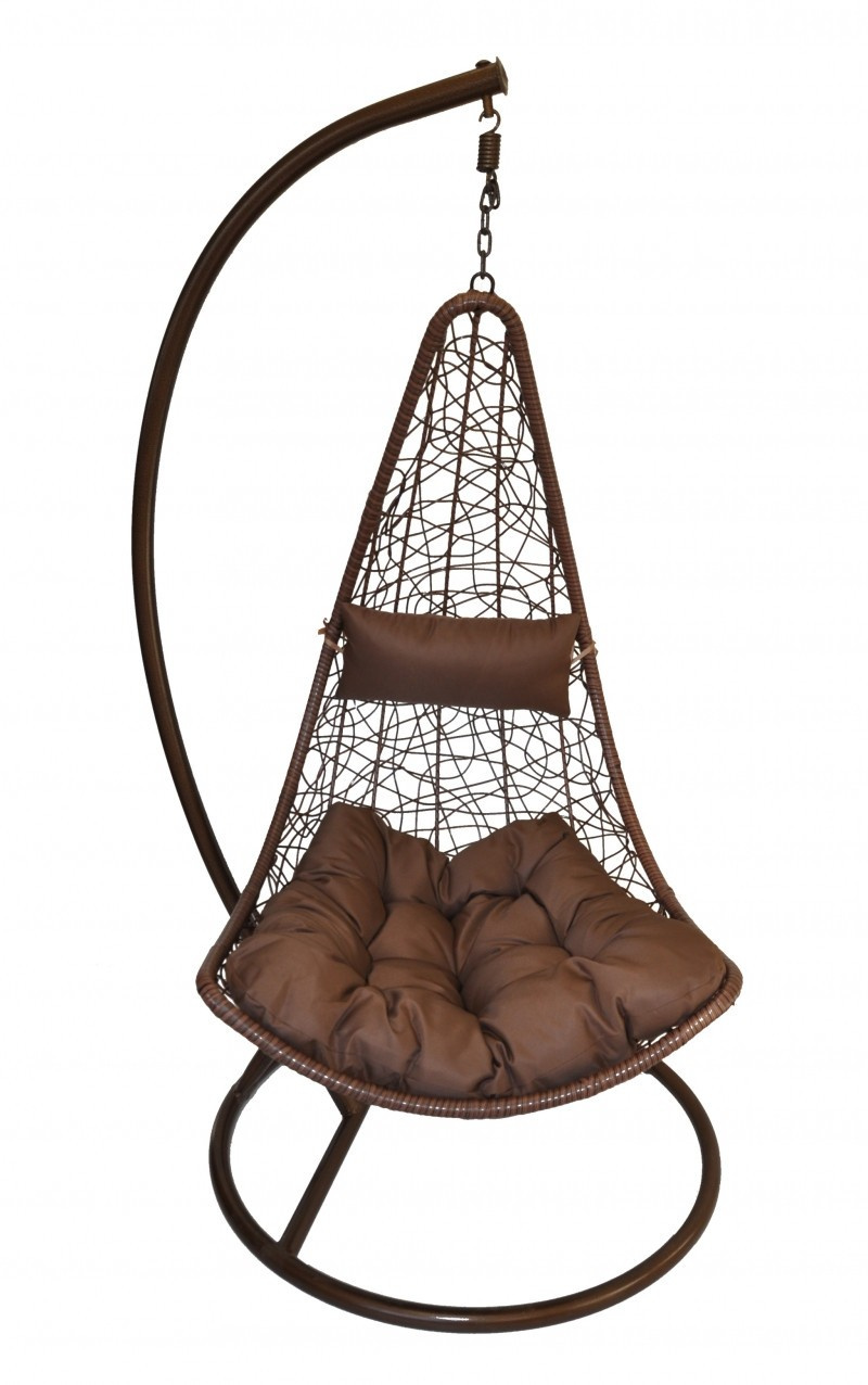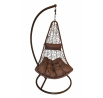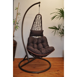 Závěsná houpačka s kovovou konstrukcí a výpletem z umělého ratanu. | Závěsná konstrukce je vyrobena z masivních ocelových trubek. Průměr základny je 105 cm a výška je 195 cm. Závěsný sedák má velikost 80x72x120 cm. Součástí je nadýchaný polštář v hnědé barvě potahové látky a také hlavový polštářek. Houpačku dodáváme včetně masivní závěsné konstrukce sloužící k zavěšení houpačky. Nosnost houpačky je 110 kg. Houpačka je vypletena z umělého ratanu, který je odolný proti povětrnostním vlivům. Houpačka je tedy určena i pro venkovní použití.