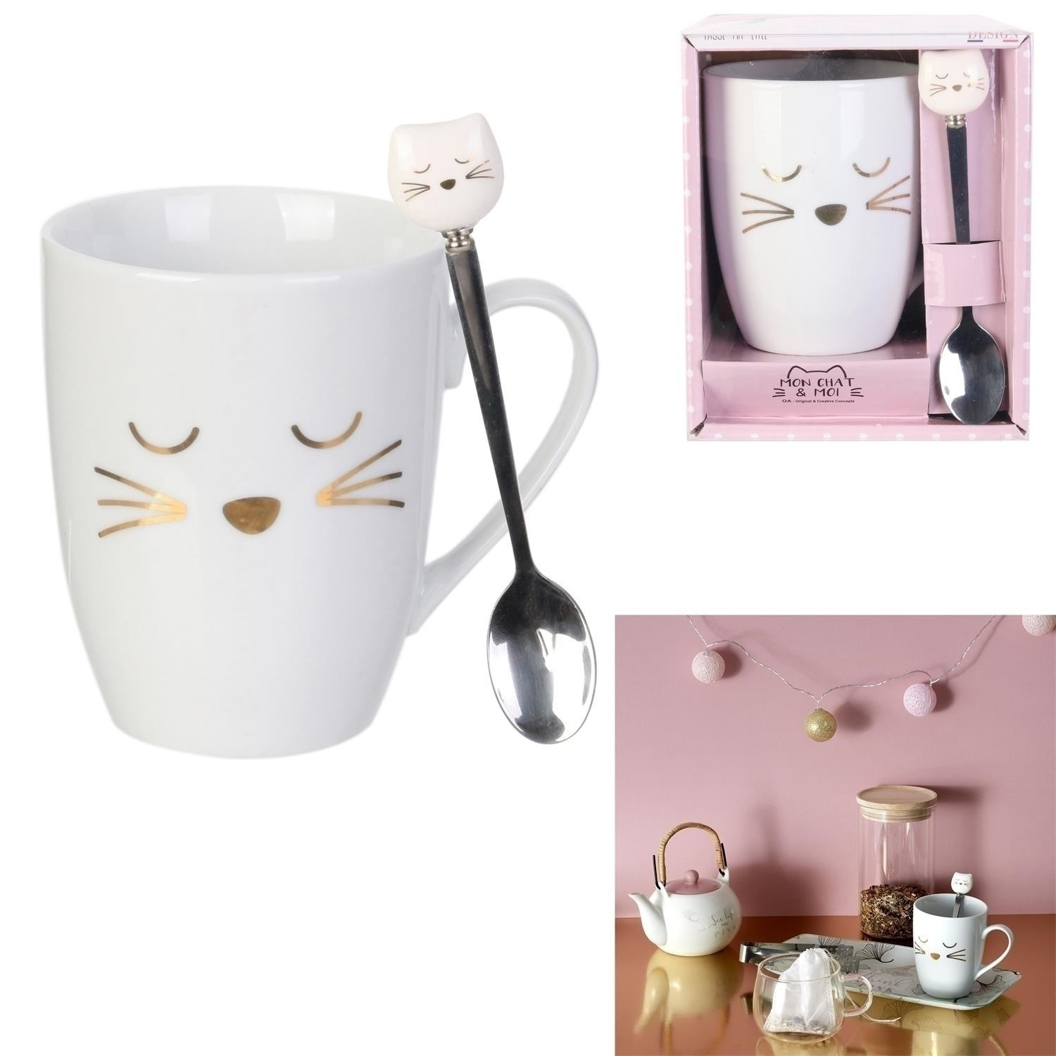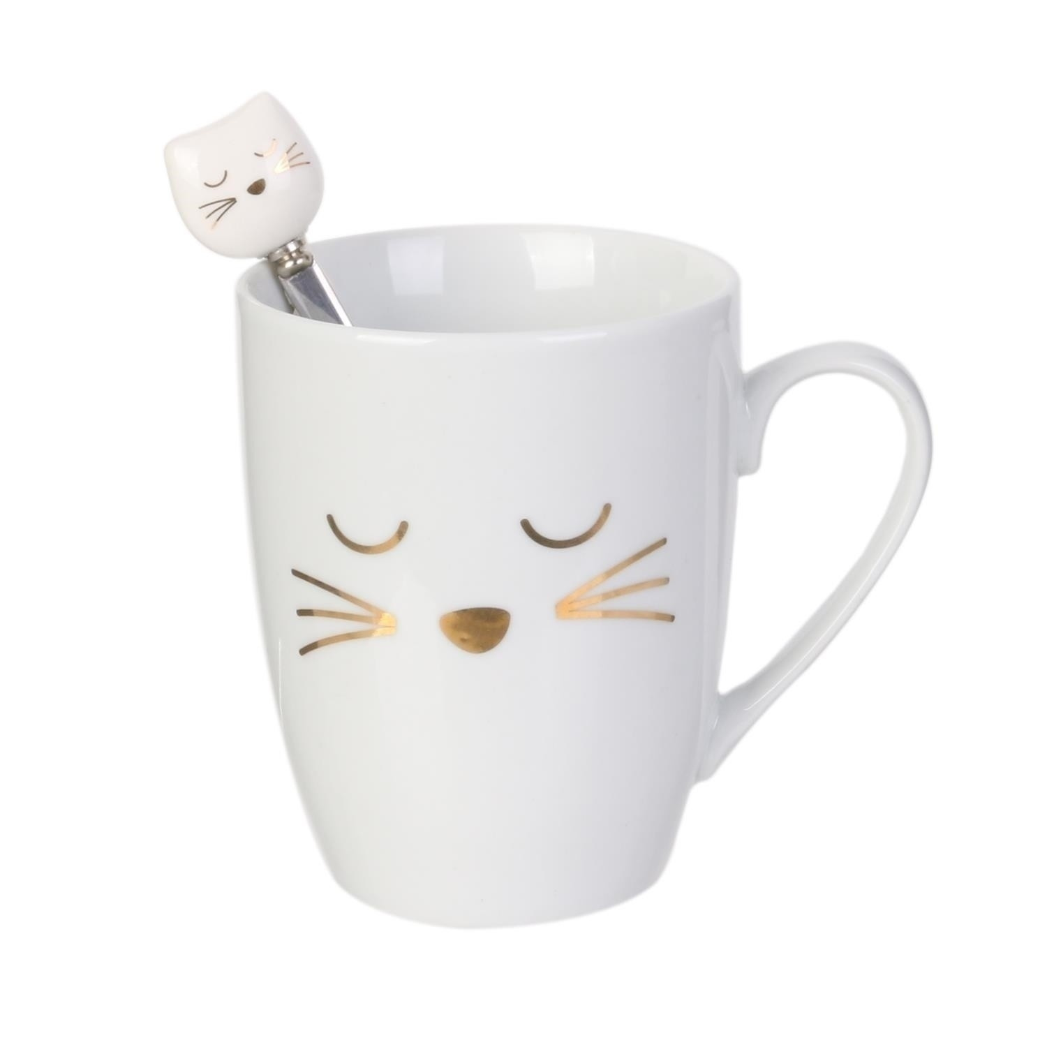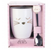 Keramický hrnek s lžičkou o objemu 350 ml osladí každou snídani. Hrnek se zlatými ozdobami imitujícími kočičí čumáček v sadě obsahuje kovovou lžičku zakončenou porcelánovou hlavičkou kočky. Hrnek a lžička díky společnému prvku tvoří zajímavý komplet. Hrnek byl zabalen do ozdobné krabičky, která z něj činí ideální dárek pro dospívající dívku nebo milovníka koček. Hrnek lze mýt v myčce.