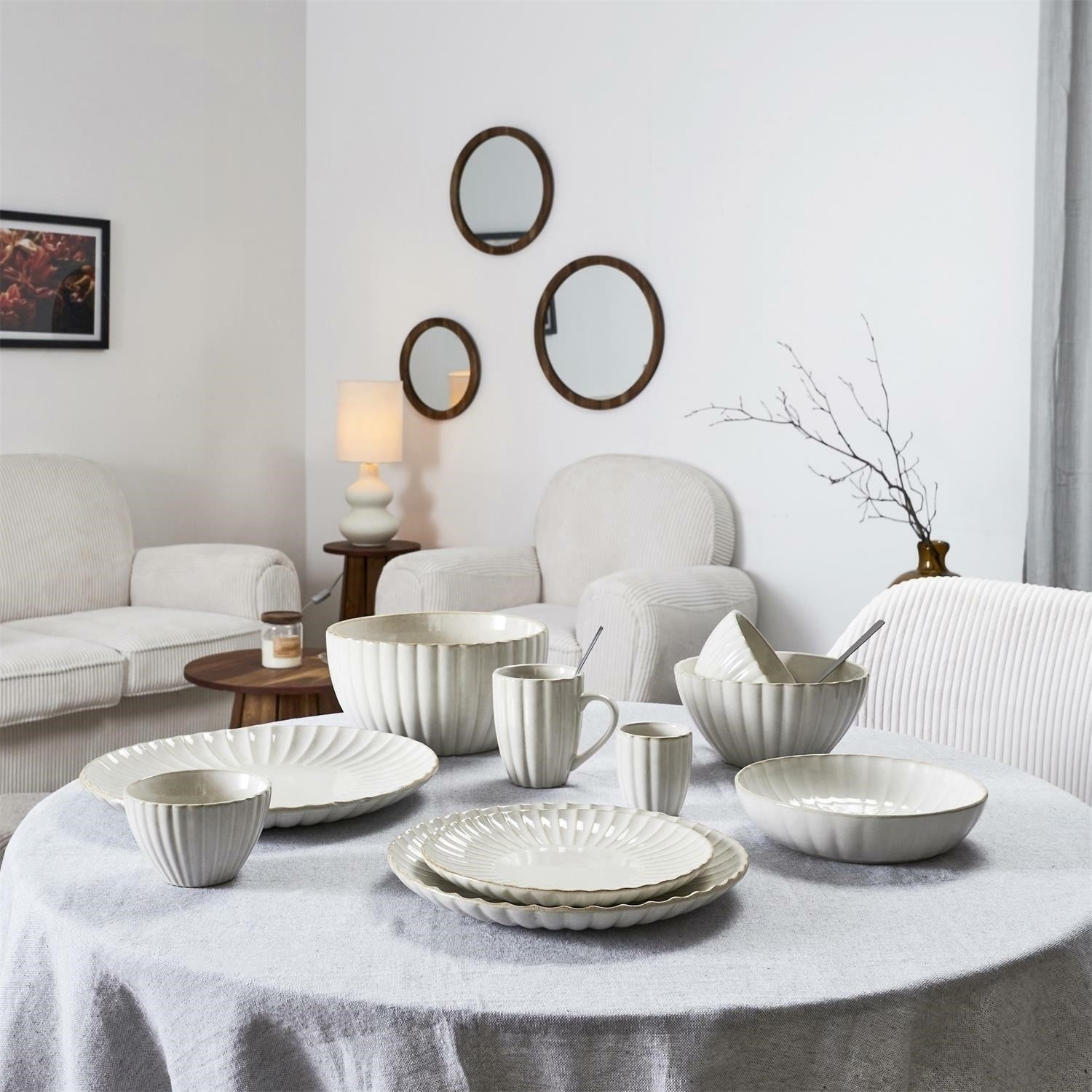 Hrnek s uchem o objemu 300 ml Vlora je umělecké dílo samo o sobě. Zajímavý tvar, jemná béžová barva činí stolní nádobí Vloga jemným a zároveň nadčasovým. Rýhované okraje misky připomínají trochu tvar mořské mušle. Hrnek lze mýt v myčce, lze používat v mikrovlnné troubě. Nelze používat v troubě a v mrazáku. Materiál: keramika