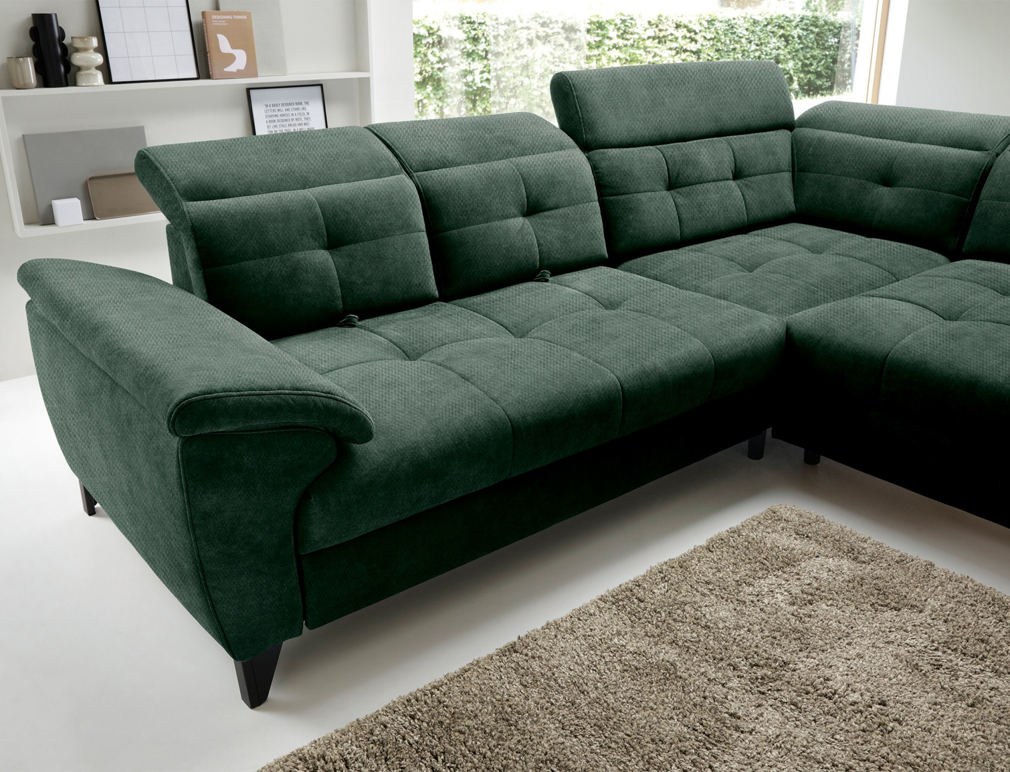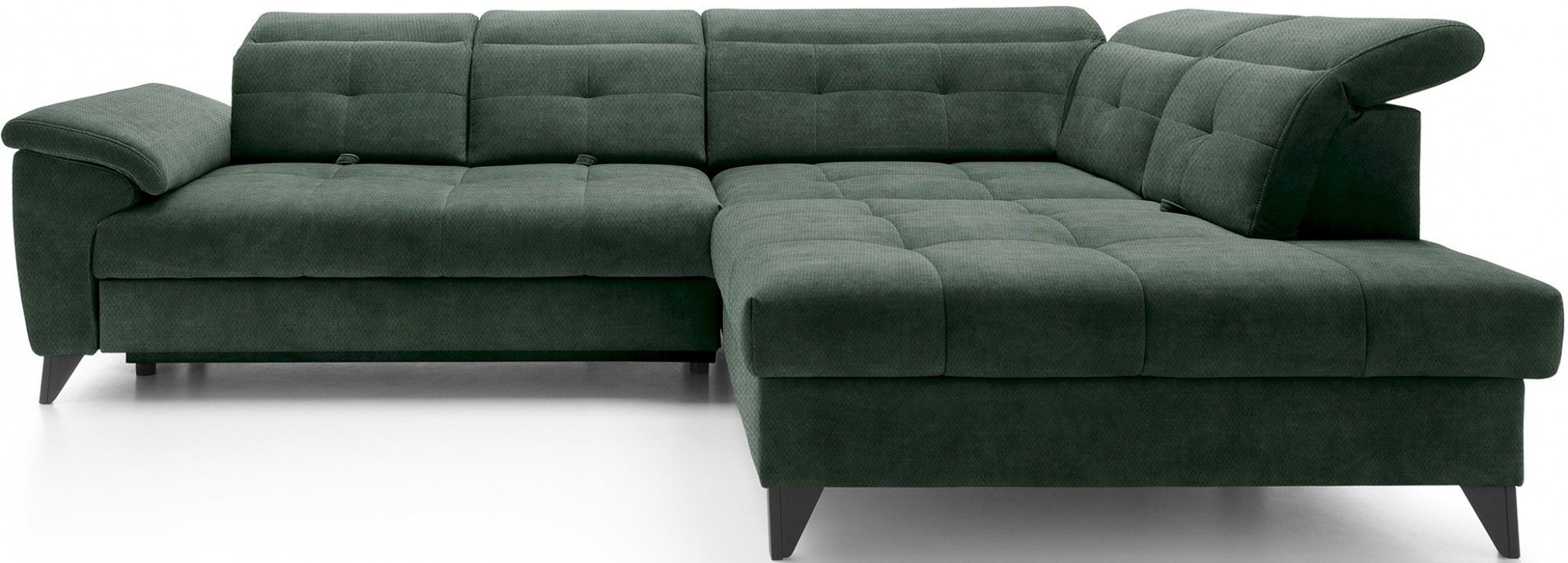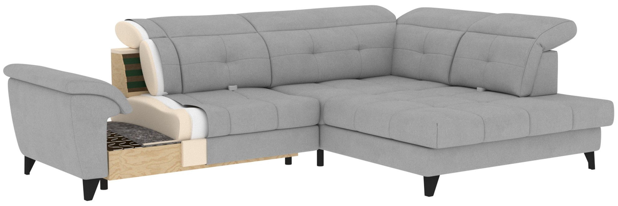 Rohová sedačka Inferne je vytříbený kus nábytku do obývacího pokoje, který kombinuje moderní design s komponenty nejvyšší kvality, poskytující nezapomenutelný uživatelský komfort. Vybaveno pružinami typu B a sedákem vyplněným vysoce elastickou pěnou HR + T2130, tento rohový gauč nabízí měkkost, pružnost a dokonalé přizpůsobení anatomickému tvaru těla, což vede k hluboké relaxaci a uvolnění svalů.Díky použití flexibilních čalounických popruhů a pěny T2130 v opěradle je rohová pohovka Inferne charakterizována odolností a odolností vůči deformacím. Udržuje si svůj původní vzhled po mnoho let, čímž eliminuje problémy s vráskami a ztrátou tvaru. Mechanismus typu Dolphin, snadno použitelný, umožňuje rychlou přeměnu rohové pohovky na pohodlnou postel, ideální jak pro vás, tak pro vaše hosty.Navíc je rohová pohovka Inferne vybavena prostorným úložným prostorem na ložní prádlo, který je diskrétně skrytý uvnitř. Toto vynikající řešení poskytuje praktické místo pro ukládání textilií. Černé kovové nohy dodávají rohové pohovce moderní charakter, čímž zdůrazňují eleganci tohoto kusu nábytku. Precizní provedení dělá z rohové pohovky Inferne nejen pohodlný prvek interiéru, ale také elegantní akcent v uspořádání obývacího pokoje.Rohová sedačka Inferne vytváří harmonii luxusu, pohodlí a funkčnosti ve vašem obývacím pokoji, slouží nejen jako místo pro relaxaci, ale také pro setkání s rodinou a přáteli.