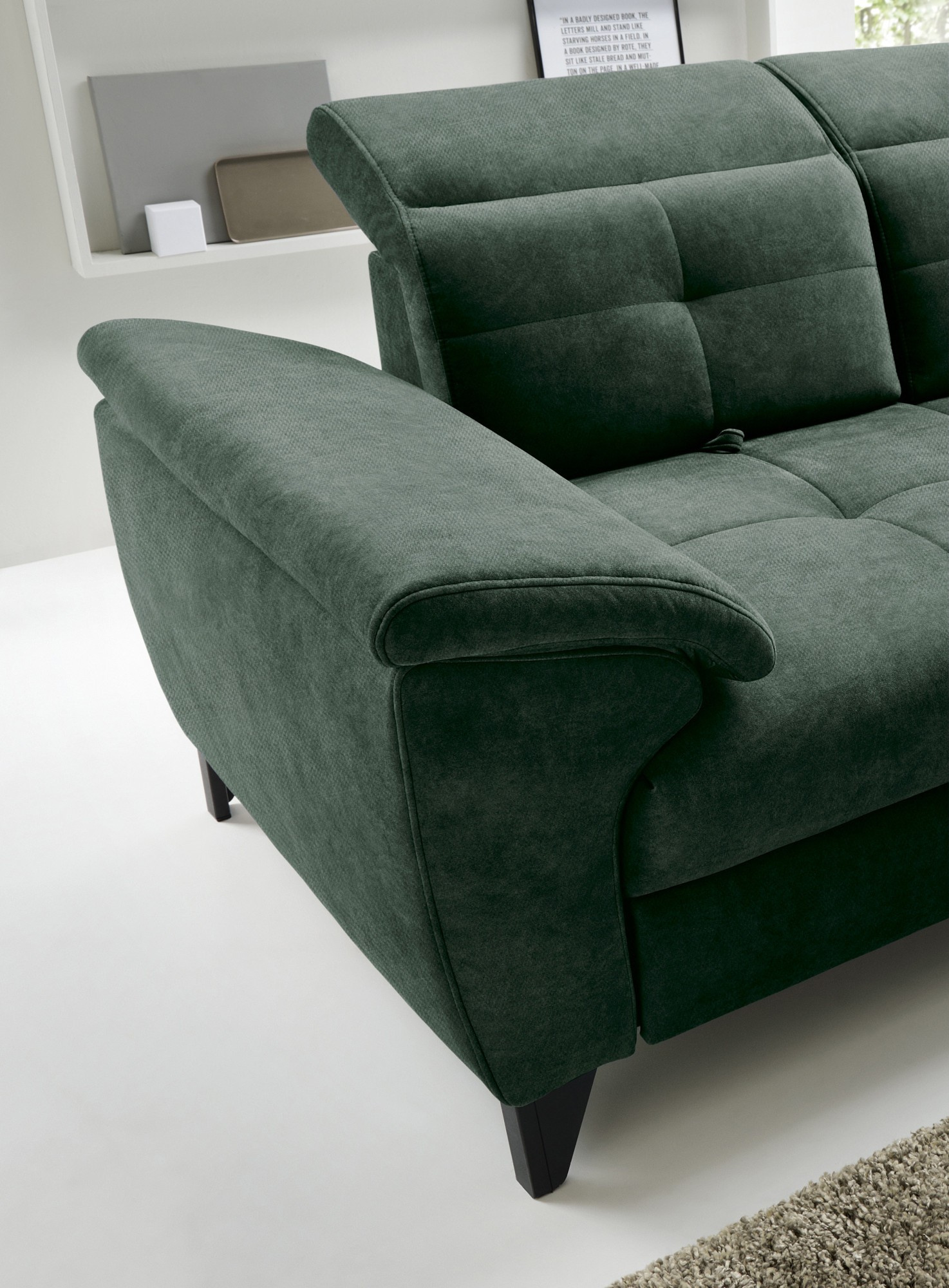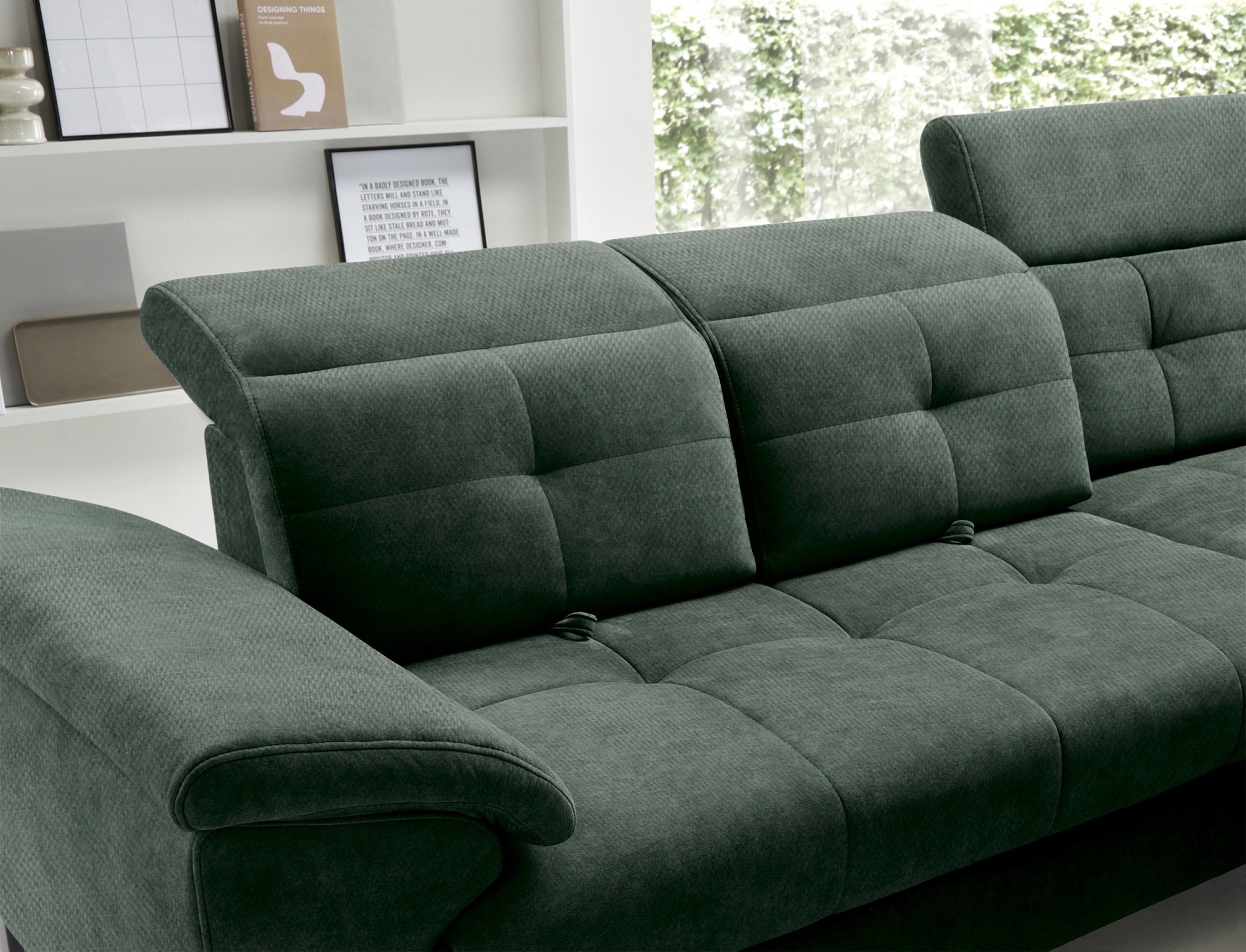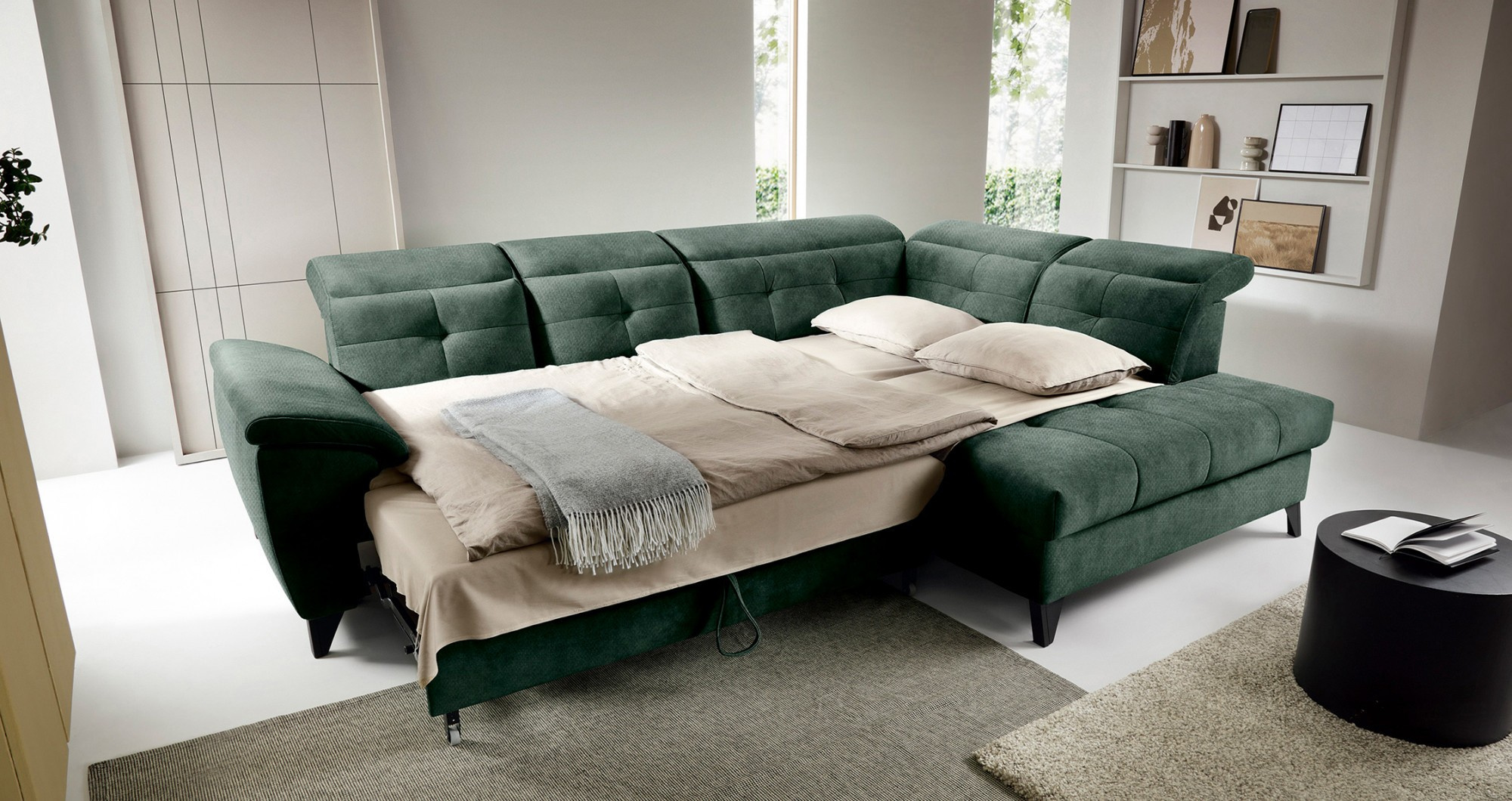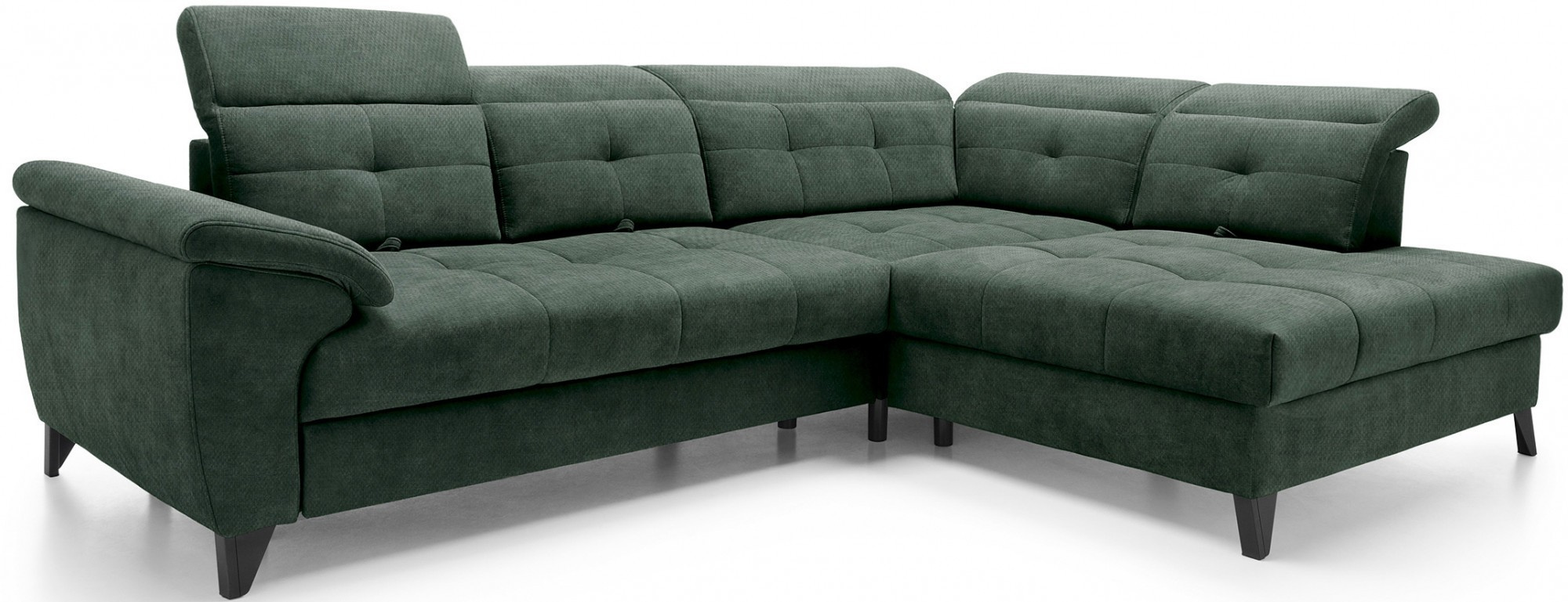 Rohová sedačka Inferne je vytříbený kus nábytku do obývacího pokoje, který kombinuje moderní design s komponenty nejvyšší kvality, poskytující nezapomenutelný uživatelský komfort. Vybaveno pružinami typu B a sedákem vyplněným vysoce elastickou pěnou HR + T2130, tento rohový gauč nabízí měkkost, pružnost a dokonalé přizpůsobení anatomickému tvaru těla, což vede k hluboké relaxaci a uvolnění svalů.Díky použití flexibilních čalounických popruhů a pěny T2130 v opěradle je rohová pohovka Inferne charakterizována odolností a odolností vůči deformacím. Udržuje si svůj původní vzhled po mnoho let, čímž eliminuje problémy s vráskami a ztrátou tvaru. Mechanismus typu Dolphin, snadno použitelný, umožňuje rychlou přeměnu rohové pohovky na pohodlnou postel, ideální jak pro vás, tak pro vaše hosty.Navíc je rohová pohovka Inferne vybavena prostorným úložným prostorem na ložní prádlo, který je diskrétně skrytý uvnitř. Toto vynikající řešení poskytuje praktické místo pro ukládání textilií. Černé kovové nohy dodávají rohové pohovce moderní charakter, čímž zdůrazňují eleganci tohoto kusu nábytku. Precizní provedení dělá z rohové pohovky Inferne nejen pohodlný prvek interiéru, ale také elegantní akcent v uspořádání obývacího pokoje.Rohová sedačka Inferne vytváří harmonii luxusu, pohodlí a funkčnosti ve vašem obývacím pokoji, slouží nejen jako místo pro relaxaci, ale také pro setkání s rodinou a přáteli.