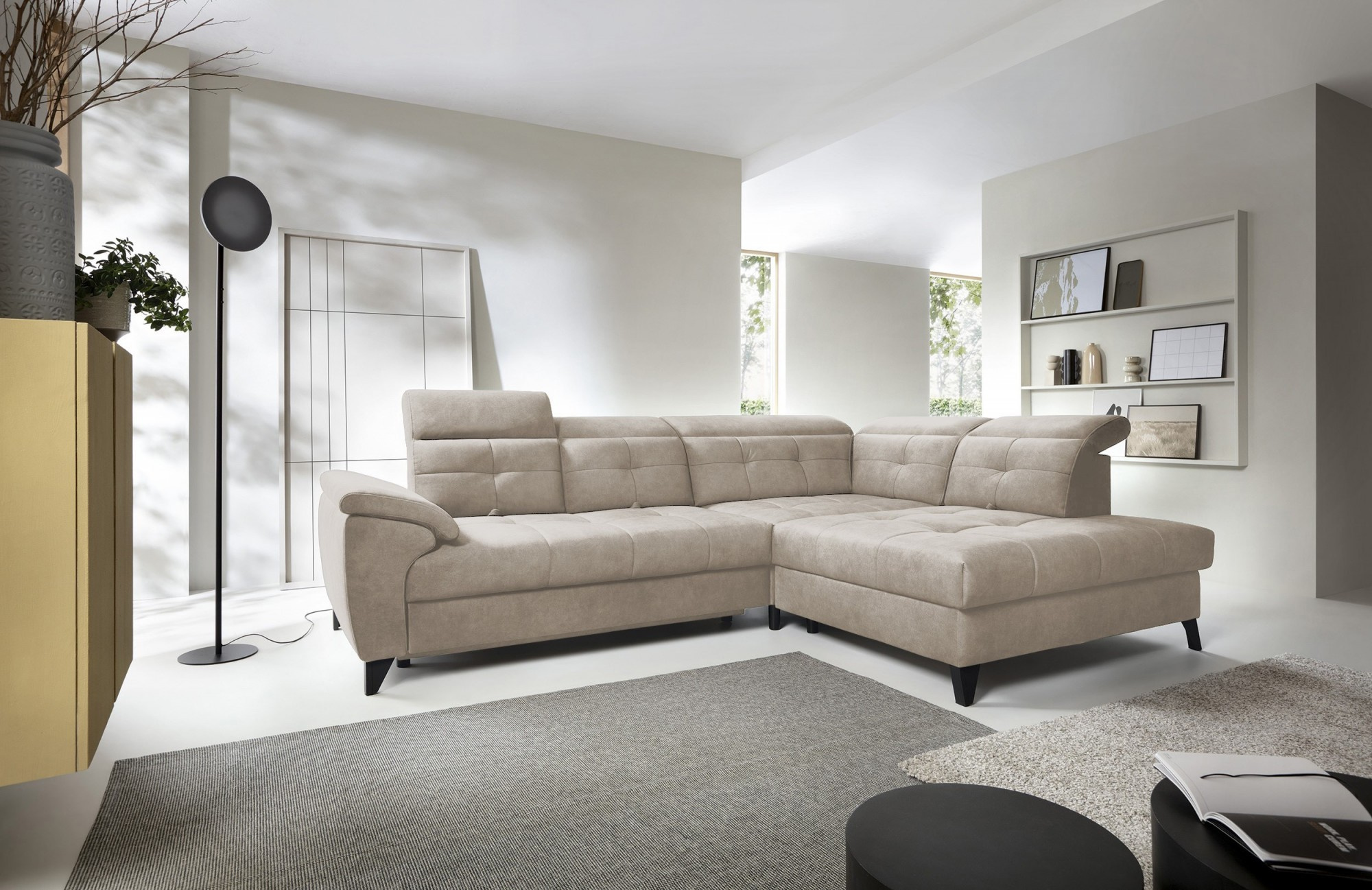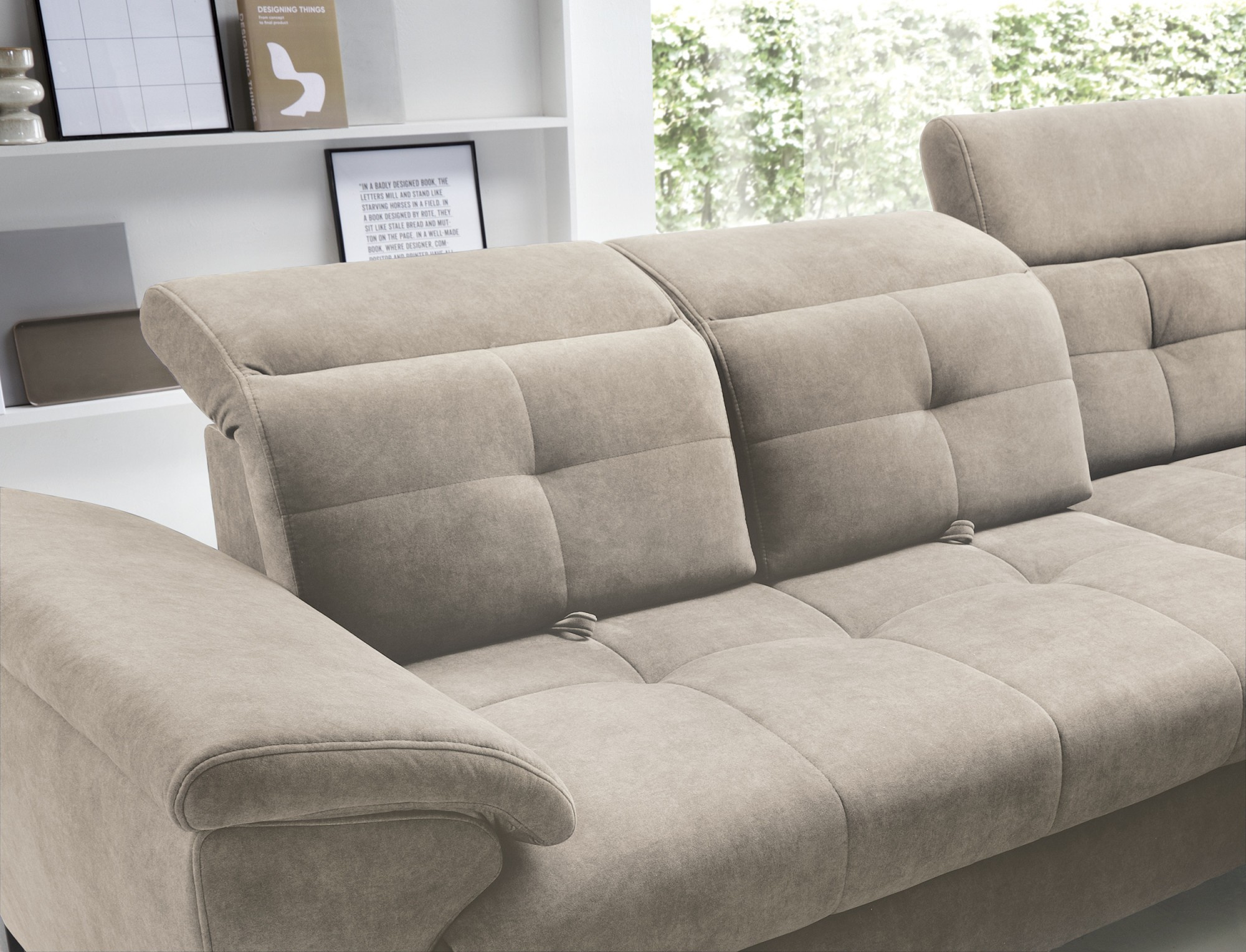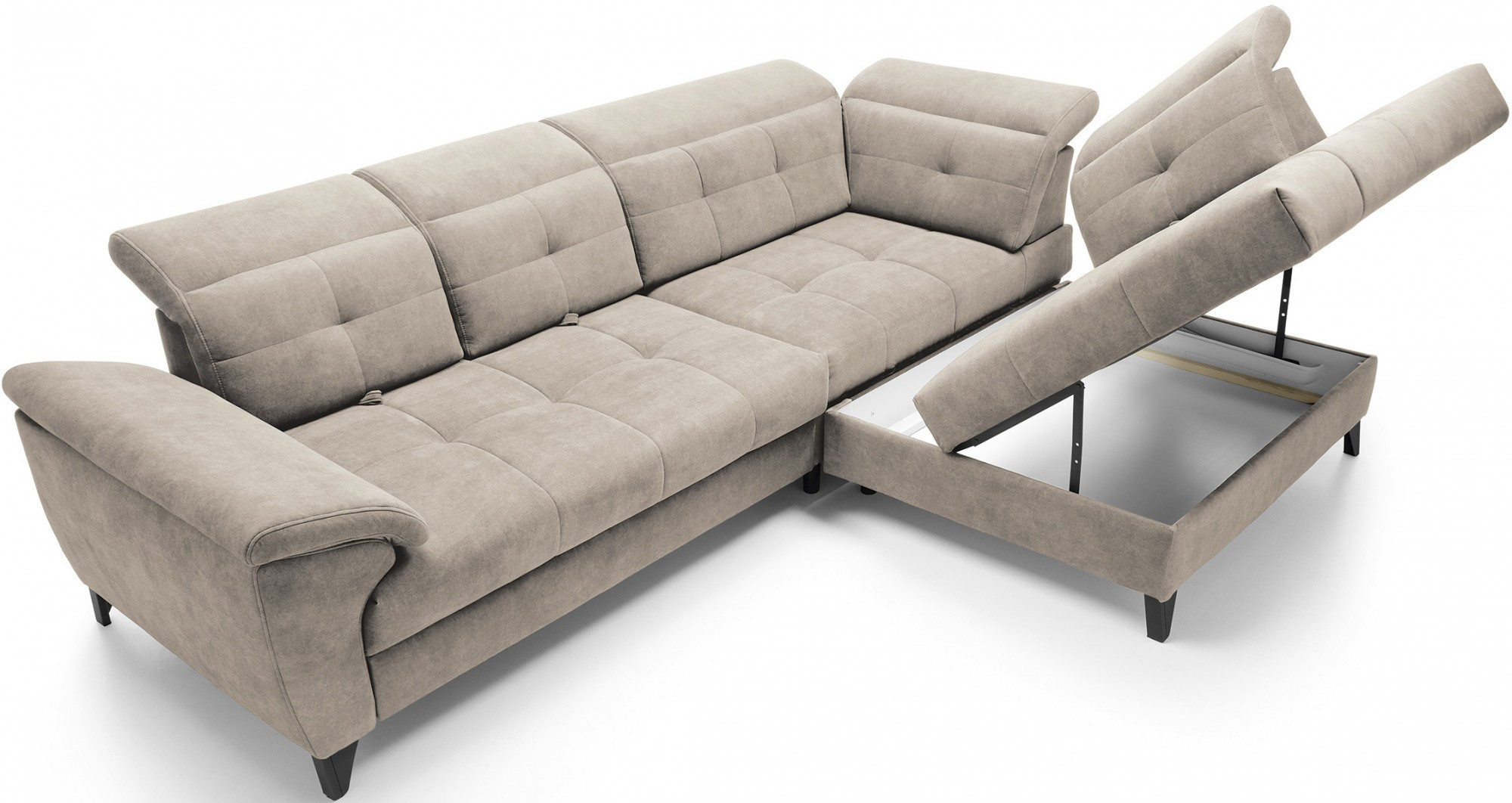 Rohová sedačka Inferne je vytříbený kus nábytku do obývacího pokoje, který kombinuje moderní design s komponenty nejvyšší kvality, poskytující nezapomenutelný uživatelský komfort. Vybaveno pružinami typu B a sedákem vyplněným vysoce elastickou pěnou HR + T2130, tento rohový gauč nabízí měkkost, pružnost a dokonalé přizpůsobení anatomickému tvaru těla, což vede k hluboké relaxaci a uvolnění svalů.Díky použití flexibilních čalounických popruhů a pěny T2130 v opěradle je rohová pohovka Inferne charakterizována odolností a odolností vůči deformacím. Udržuje si svůj původní vzhled po mnoho let, čímž eliminuje problémy s vráskami a ztrátou tvaru. Mechanismus typu Dolphin, snadno použitelný, umožňuje rychlou přeměnu rohové pohovky na pohodlnou postel, ideální jak pro vás, tak pro vaše hosty.Navíc je rohová pohovka Inferne vybavena prostorným úložným prostorem na ložní prádlo, který je diskrétně skrytý uvnitř. Toto vynikající řešení poskytuje praktické místo pro ukládání textilií. Černé kovové nohy dodávají rohové pohovce moderní charakter, čímž zdůrazňují eleganci tohoto kusu nábytku. Precizní provedení dělá z rohové pohovky Inferne nejen pohodlný prvek interiéru, ale také elegantní akcent v uspořádání obývacího pokoje.Rohová sedačka Inferne vytváří harmonii luxusu, pohodlí a funkčnosti ve vašem obývacím pokoji, slouží nejen jako místo pro relaxaci, ale také pro setkání s rodinou a přáteli.