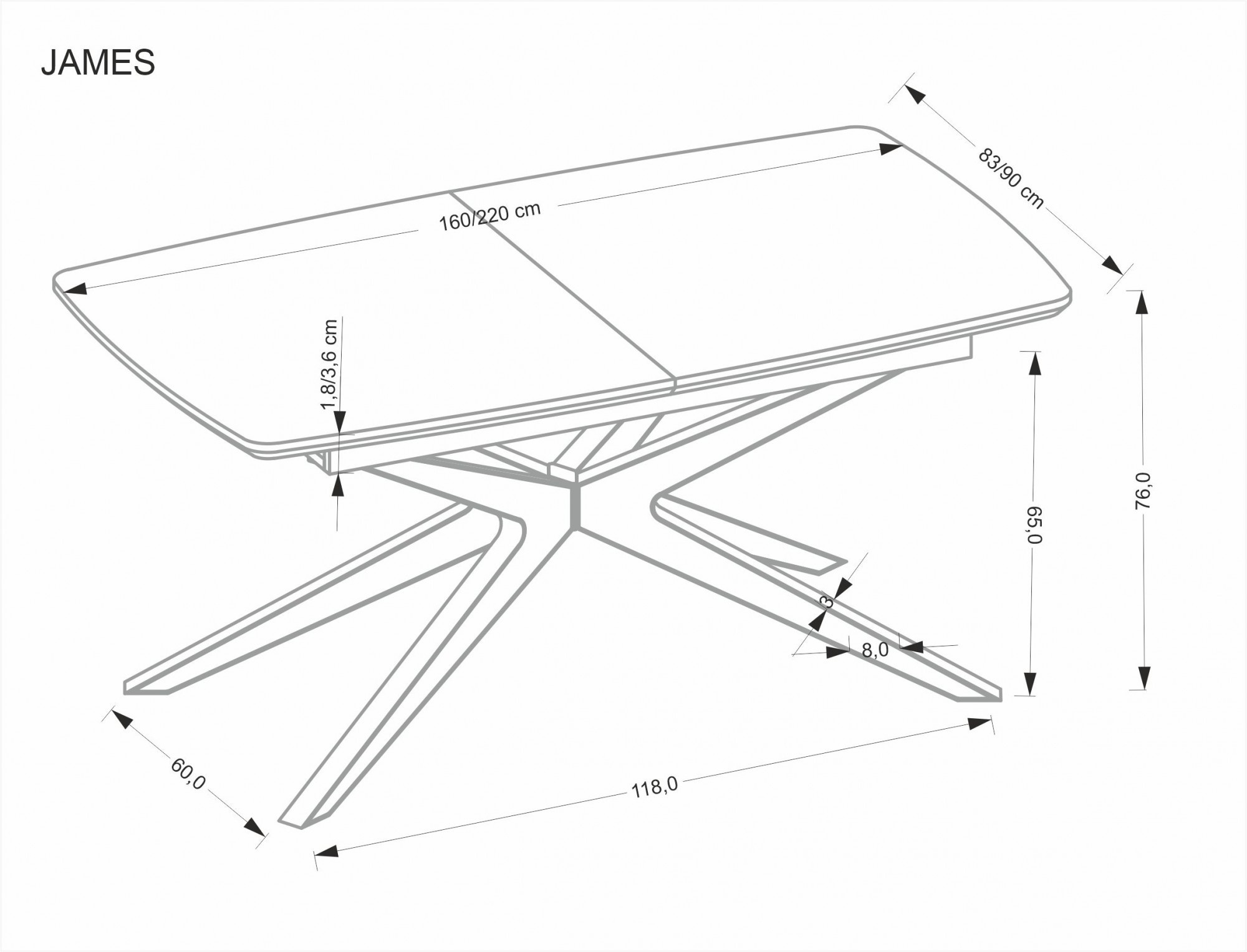 Stůl JAMES nabízí dostatek prostoru pro pohodlné stolování. V základní konfiguraci má šířku 160 cm a výšku 76 cm, což je ideální pro běžné rodinné večeře. Pokud však očekáváte více hostů, oceníte jeho rozkládací funkci, která umožňuje prodloužení stolu až na 220 cm. Tato flexibilita zajišťuje, že budete vždy připraveni na větší společenské události.