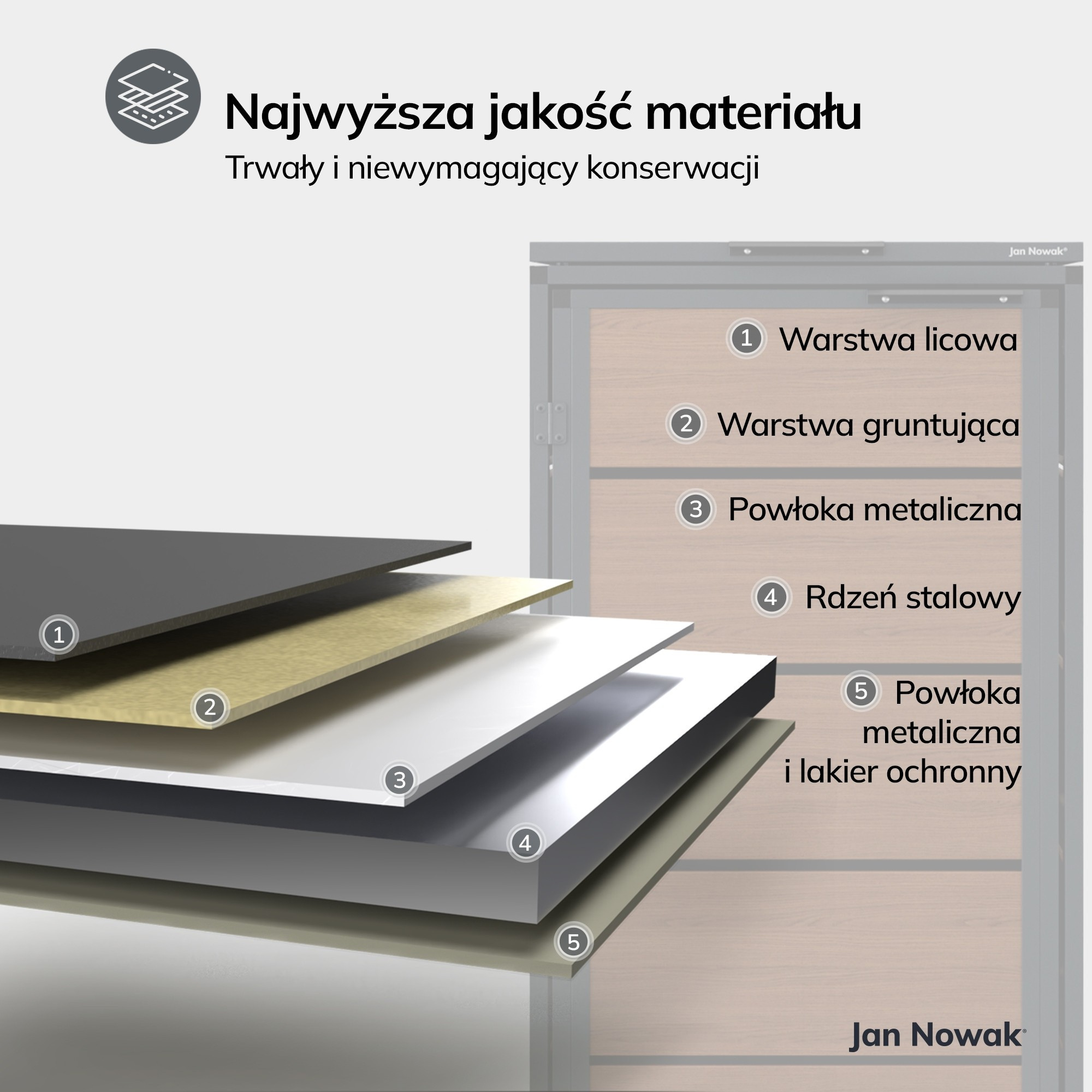 Kontejner na odpadky je vyroben z nejkvalitnějších surovin, což se promítá do jeho vysoké odolnosti. Konstrukce z pozinkovaného plechu lakovaného práškovou barvou je odolná proti promáčknutí a poškrábání, což z ní činí výhodnou investici na léta. Promyšlená konstrukce umožňuje snadné umístění sestavy na rovný povrch. Navíc vestavba umožňuje volný průtok vzduchu, a tím i redukci nežádoucích pachů.