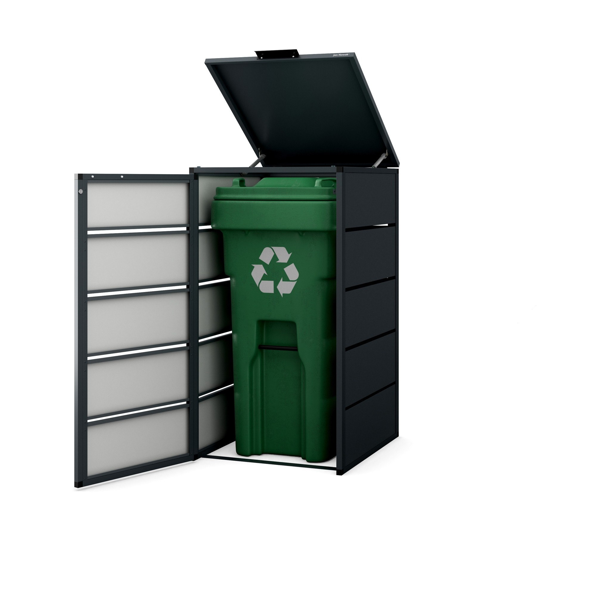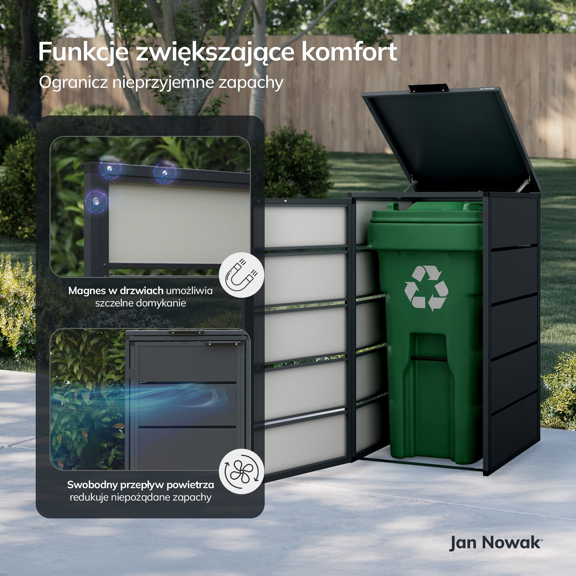 Funkčnost a kompaktnost vestavby jdou ruku v ruce s příjemným vzhledem. Univerzálnost a moderní minimalismus zajišťují, že odpadkový přístřešek se dokonale hodí do jakéhokoli prostoru a bude atraktivním prvkem před domem nebo pracovištěm. Antracitová barva je elegantní a nadčasová, takže se hodí k různým stylům architektury.
