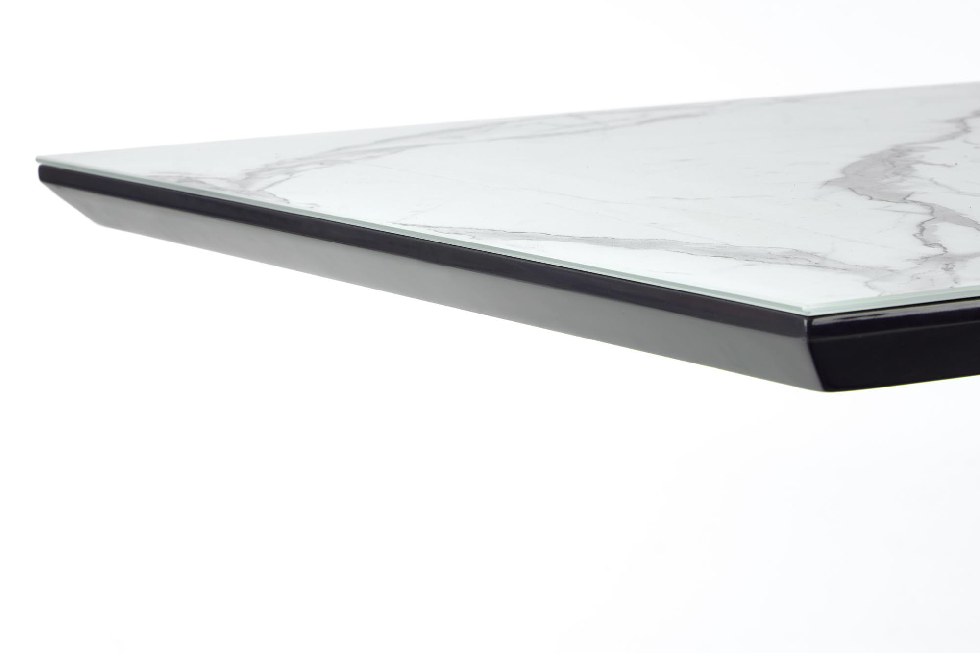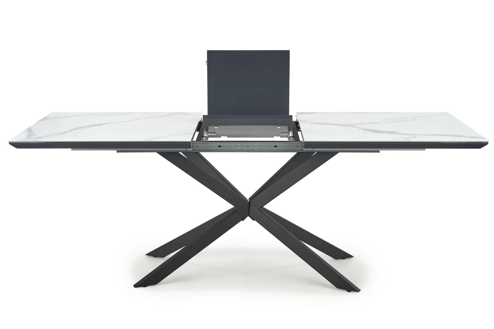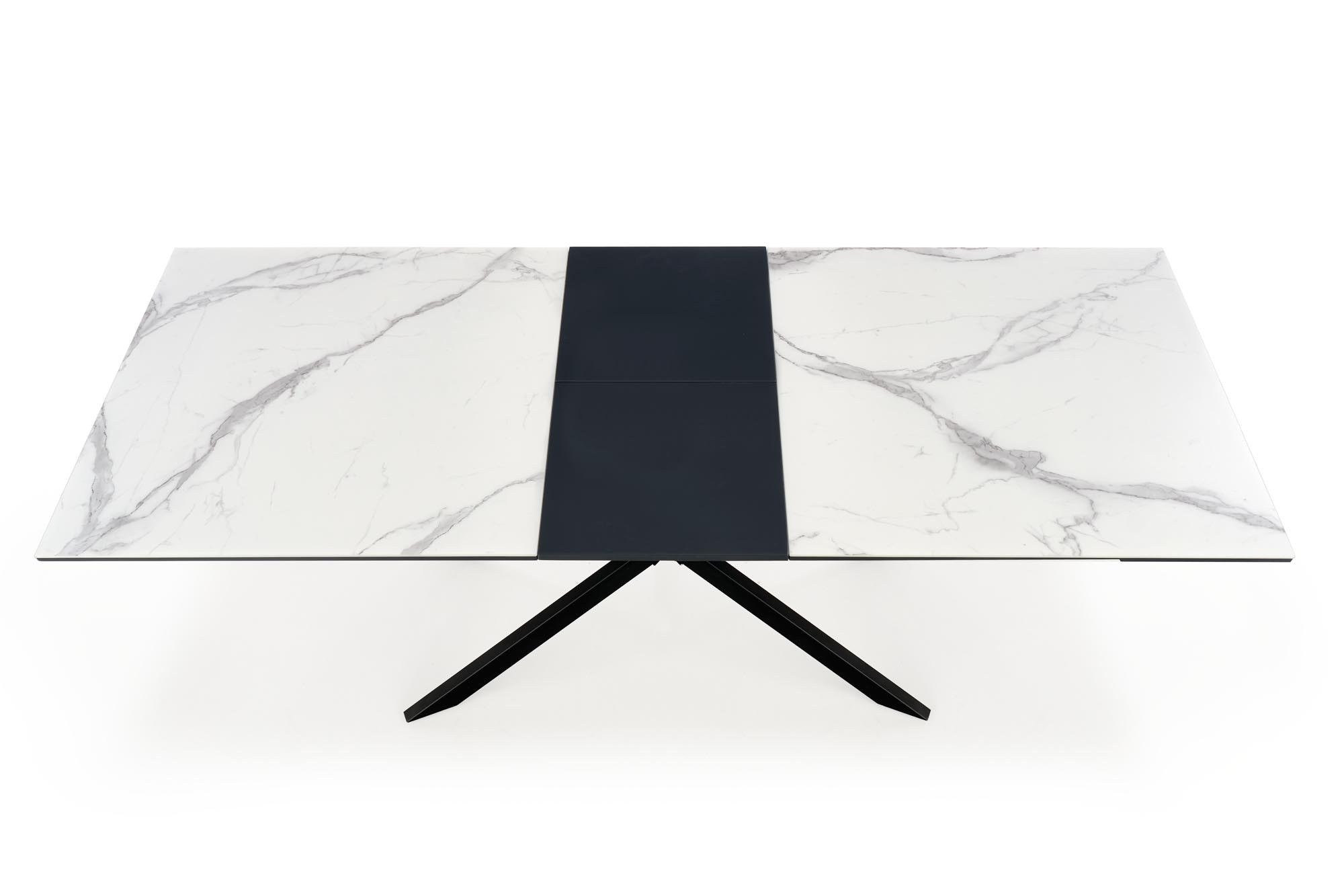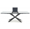 rozkládací stůl, rozměry: 160-200/90/76 cm, materiál: sklo / lakovaná MDF / práškově lakovaná ocel, barva: horní deska - bílý mramor / tmavě šedá, nohy - černé
