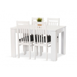Jídelní sestava Dante 4 se skládá ze stolu a čtyř židlí. Tato jídelní sestava splní svůj účel na výbornou nejen v kuchyni, ale i v jídelně, nebo obývacím pokoji s jídelním koutem. Svou vysokou kvalitou a precizním zpracováním, uspokojí všechny budoucí, i ty velmi náročné, uživatele. Stůl je vyrobený z bílého matného lamina tl.22 mm, kostry židlí z bukového dřeva, barveného na bílou barvu. Jídelní sestava je dodávaná v demontu. Součástí balení je schématický montážní návod, včetně všech potřebných spojovacích prvků. Cena je uvedena za jídelní stůl a 4 židle. Vlivem nastavení monitorů, nebo displejů telefonů, se zobrazení barev na fotograii může od skutečnosti lišit. Úvodní fotografie je ilustrační. Židle budou dodané v modré barvě.