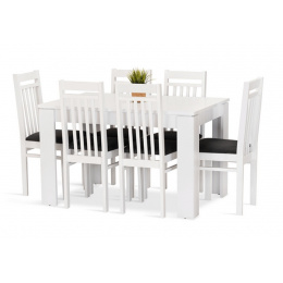 Jídelní sestava Dante 6 se skládá ze stolu a šesti židlí. Tato jídelní sestava splní svůj účel na výbornou nejen v kuchyni, ale i v jídelně, nebo obývacím pokoji s jídelním koutem. Svou vysokou kvalitou a precizním zpracováním, uspokojí všechny budoucí, i ty velmi náročné, uživatele. Stůl je vyrobený z bílého matného lamina tl.22 mm, kostry židlí z bukového dřeva, barveného na bílou barvu. Jídelní sestava je dodávaná v demontu. Součástí balení je schématický montážní návod, včetně všech potřebných spojovacích prvků. Cena je uvedena za jídelní stůl a 6 židlí. Vlivem nastavení monitorů, nebo displejů telefonů, se zobrazení barev na fotograii může od skutečnosti lišit.