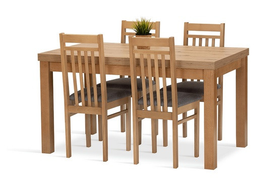 Jídelní sestava Meteor 4 se skládá z rozkládacího stolu a čtyř židlí. Tato jídelní sestava splní svůj účel na výbornou nejen v kuchyni, ale i v jídelně, nebo obývacím pokoji s jídelním koutem. Svou vysokou kvalitou a precizním zpracováním, uspokojí všechny budoucí, i ty velmi náročné, uživatele. Nohy stolu a kostry židlí jsou vyrobeny z bukového dřeva, mořeného tak, aby ladily s deskou stolu, která je vyrobená z lamina v dekoru dub artisan. Jídelní sestava je dodávaná v demontu. Součástí balení je schématický montážní návod, včetně všech potřebných spojovacích prvků. Cena je uvedena za jídelní stůl a 4 židle. Vlivem nastavení monitorů, nebo displejů telefonů, se zobrazení barev na fotograii může od skutečnosti lišit. Úvodní fotografie je ilustrační. Židle budou dodány v modré barvě.