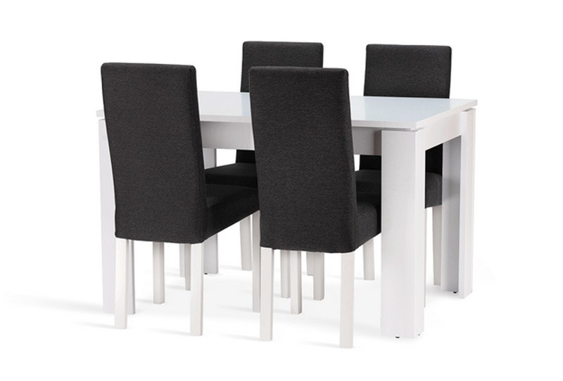 Jídelní sestava Neon 4 se skládá ze stolu a čtyř židlí. Tato jídelní sestava svou vysokou kvalitou a precizním zpracováním uspokojí všechny budoucí uživatele. Stůl je vyrobený z bílého matného lamina tl.22 mm, kostry židlí z bukového dřeva, barveného na bílou barvu. Jídelní sestava je dodávaná v demontu. Součástí balení je schématický montážní návod, včetně všech potřebných spojovacích prvků. Cena je uvedena za jídelní stůl a 4 židle. Vlivem nastavení monitorů, nebo displejů telefonů, se zobrazení barev na fotograii může od skutečnosti lišit. Úvodní fotografie je ilustrační. Židle budou dodány v modré barvě.