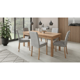 Sada RODOS 81 se ideálně hodí do vaší jídelny. Sada obsahuje stůl s obdélníkovou deskou a šest čalouněných židlí. Stůl můžeš rozložit pomocí vložky, která prodlouží desku až na 180 cm. Stylové židle se vyznačují stabilními nohami vyrobenými z bukového dřeva a čalouněným sedákem a opěradlem s libovolnou potahovou látkou na výběr z ukázaných v galerii. Díky široké škále barev se sada hodí do každého interiéru a doplní váš obývací pokoj, kuchyň nebo jídelnu...