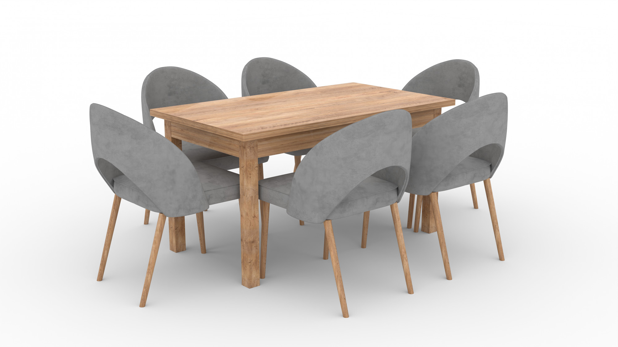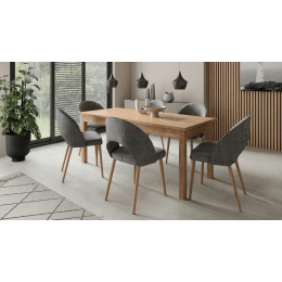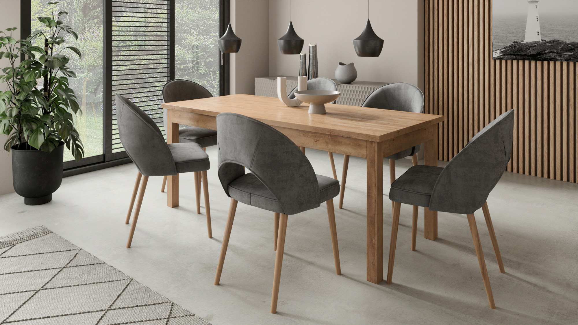 Sada RODOS 82 se ideálně hodí do vaší jídelny. Sada obsahuje stůl s obdélníkovou deskou a šest čalouněných židlí. Stůl můžeš rozložit pomocí vložky, která prodlouží desku až na 180 cm. Stylové židle se vyznačují stabilními nohami vyrobenými z bukového dřeva a čalouněným sedákem a opěradlem s libovolnou potahovou látkou na výběr z ukázaných v galerii. Díky široké škále barev se sada hodí do každého interiéru a doplní váš obývací pokoj, kuchyň nebo jídelnu...
