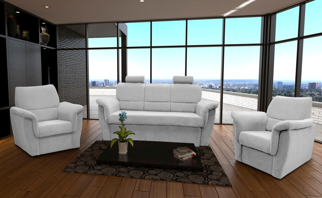 Sedací souprava Nadia vyniká svým elegantním vzhledem a praktičností. Je rozkládací a úložný prostor najdete jak v pohovce, tak v obou křeslech. Jednoduchým rozkladem vynikne lůžko k příležitostnému přespání. Výpň sedáků tvoří pružiny bonell s kvalitní PUR pěnou. Tato kombinace zajistí velmi pohodlné sezení. V ceně pohovky jsou 2 výškově nastavitelné opěrky hlavy, které podtrhnou komfort sezení. Ostatní vyobrazené dekorace nejsou v ceně.