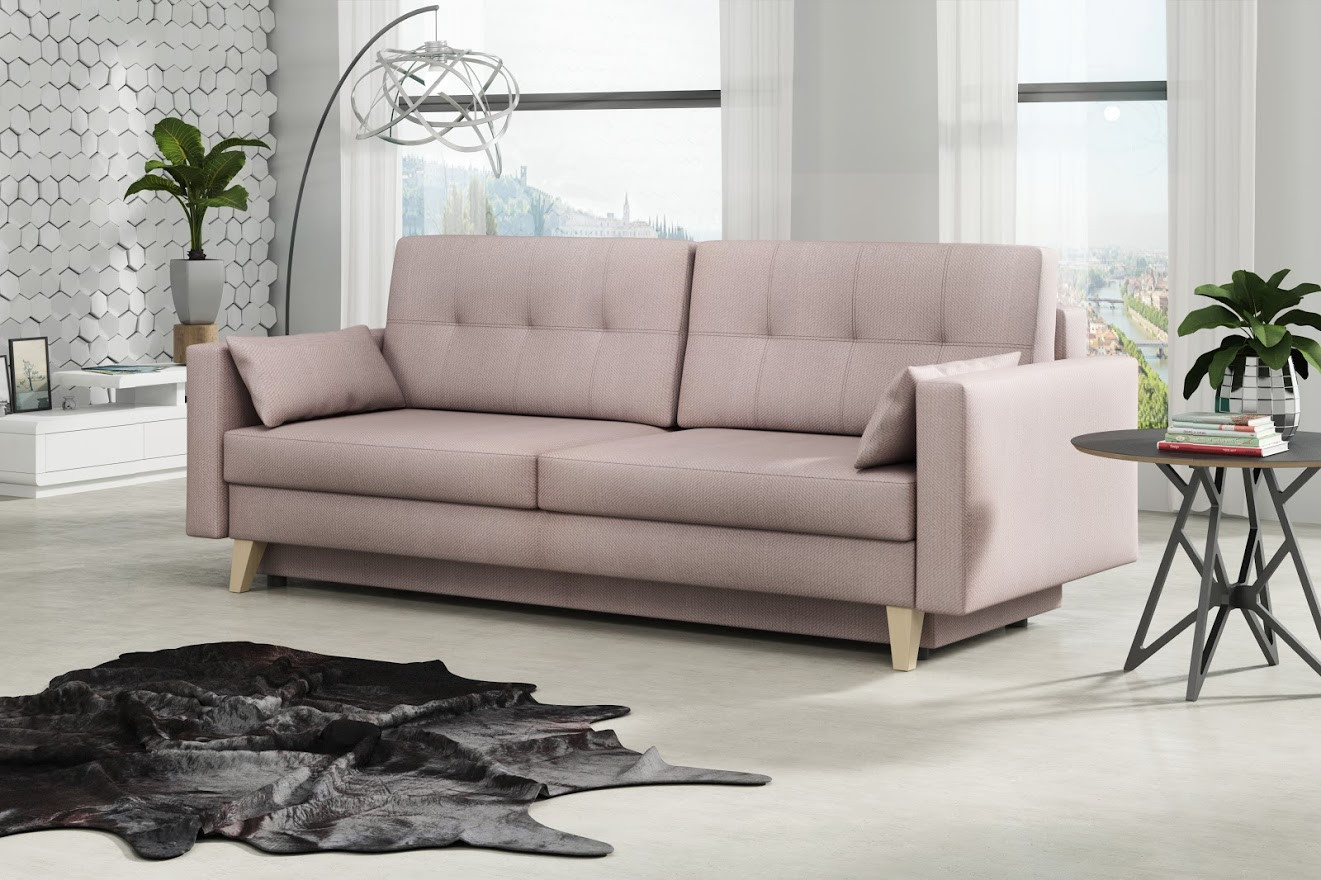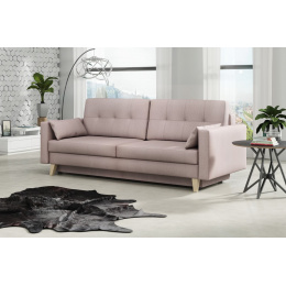 Pohovka Marina je krásným elegantním kouskem s nádechem RETRO designu a výborně zapadne do každého interiéru. Retro design podtrhují zešikmené dřevěné nohy a látkové knoflíky na opěrce. Pohovka je rozkládací a samozřejmostí je i nepostradatelný úložný prostor. Jednoduchým rozložením pomocí automatu vznikne dostatečně prostorné lůžko občasnému přespání Vaší návštěvy. Výpň sedáku tvoří vlnité pružiny v kombinaci s pružinami bonell a kvalitní PUR pěnou. Pohovka je celočalouněná, takže ji můžete umístit i do prostoru. Výborně se hodí do obývacího pokoje, do pracovny či pokoje pro hosty. Pohovku nabízíme v několika trendy barvách. Vyobrazené dopňky a dekorace nejsou v ceně. Zobrazení barev produktu na fotograii se může nepatrně lišit od skutečnosti.