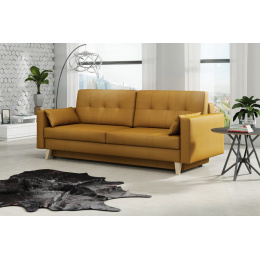 Pohovka Marina je krásným elegantním kouskem s nádechem RETRO designu a výborně zapadne do každého interiéru. Retro design podtrhují zešikmené dřevěné nohy a látkové knoflíky na opěrce. Pohovka je rozkládací a samozřejmostí je i nepostradatelný úložný prostor. Jednoduchým rozložením pomocí automatu vznikne dostatečně prostorné lůžko občasnému přespání Vaší návštěvy. Výpň sedáku tvoří vlnité pružiny v kombinaci s pružinami bonell a kvalitní PUR pěnou. Pohovka je celočalouněná, takže ji můžete umístit i do prostoru. Výborně se hodí do obývacího pokoje, do pracovny či pokoje pro hosty. Pohovku nabízíme v několika trendy barvách. Vyobrazené dopňky a dekorace nejsou v ceně. Zobrazení barev produktu na fotograii se může nepatrně lišit od skutečnosti.