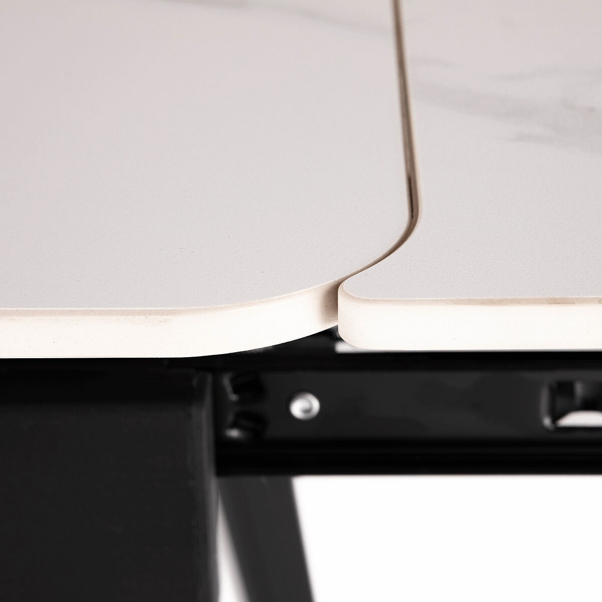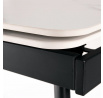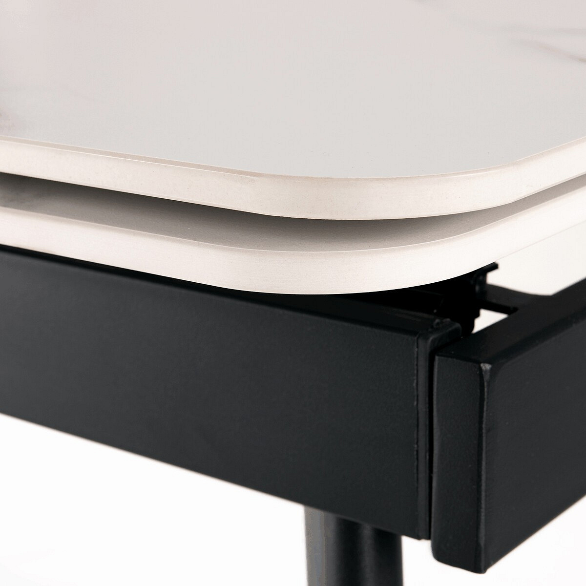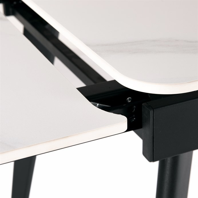 Jídelní rozkládací stůl HT-405M WT kombinuje moderní design s praktickou funkčností. Deska stolu je vyrobena z matné keramické plochy s mramorovým dekorem, která je odolná vůči poškrábání a snadno se udržuje v čistotě. Pevné kovové nohy v černé barvě zajišťují stabilitu a dlouhou životnost. Stůl disponuje rozkládacím mechanismem s možností prodloužení o 60 cm (2x 30 cm), který je vybaven uzamykacím systémem pro bezpečné a pevné zajištění v rozložené poloze. Rozměry 120+30+30x80x74 cm poskytují dostatek prostoru pro pohodlné stolování i větší společnost.