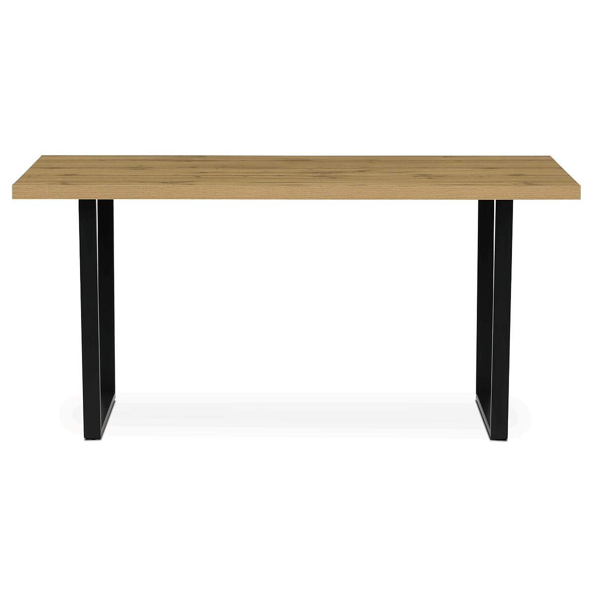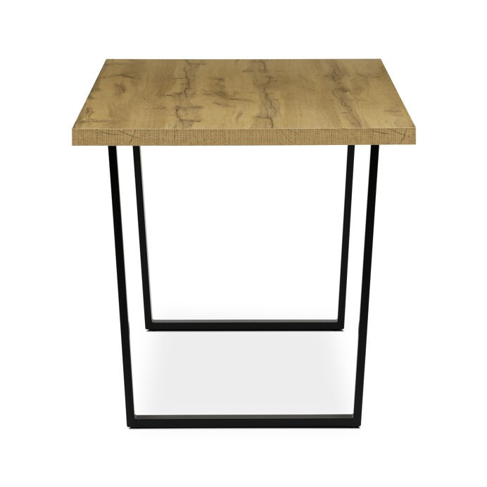 Jídelní stůl o rozměrech 160x80x76 cm kombinuje desku z hnědého lamina s dekorem dubu a stabilní kovovou podnož v černém matném provedení. Deska je opatřena ABS hranou, která chrání okraje před poškozením a usnadňuje údržbu, zatímco matný povrch zajišťuje příjemný vzhled bez lesku. Pevná kovová podnož poskytuje vysokou stabilitu a nosnost, což umožňuje pohodlné využití v jídelních prostorách. Materiál desky je navržen pro snadnou údržbu a odolnost vůči běžnému opotřebení, což přispívá k dlouhé životnosti stolu. Tento model je ideální volbou pro moderní interiéry, kde se klade důraz na funkčnost a jednoduchý design.