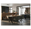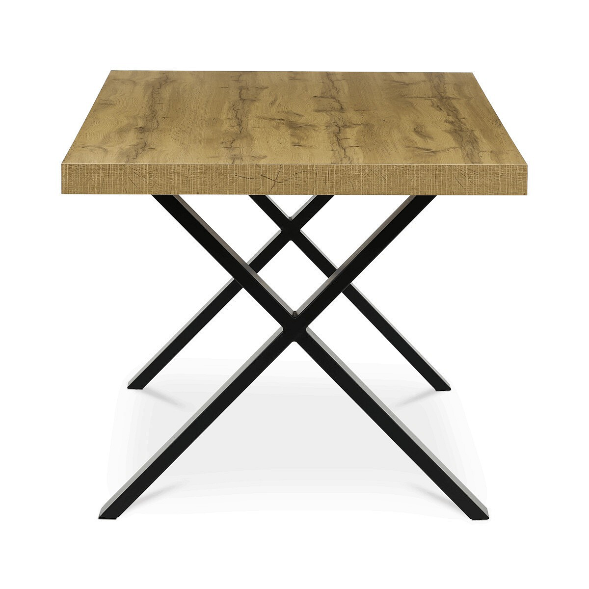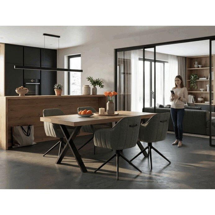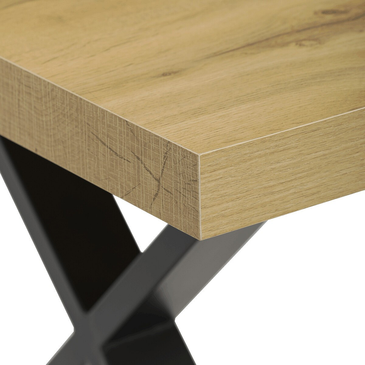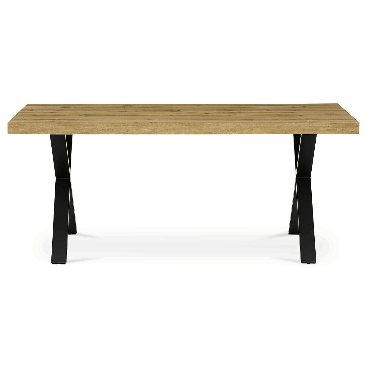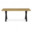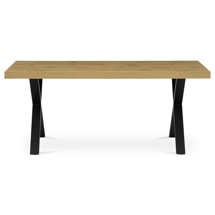 Jídelní stůl HT-R5316 OAK nabízí prostornou pracovní plochu o rozměrech 180x90 cm, která je vyrobena z odolného lamina s matnou povrchovou úpravou v dekoru dubu. Deska je opatřena ABS hranou, která chrání okraje před poškozením a usnadňuje údržbu. Stabilní kovové nohy ve tvaru X v černém provedení zajišťují pevnou oporu a moderní industriální vzhled. Stůl je navržen bez rozkládací funkce, což podtrhuje jeho jednoduchost a robustnost. Výška 76 cm odpovídá standardním ergonomickým parametrům pro pohodlné sezení u jídelního stolu.