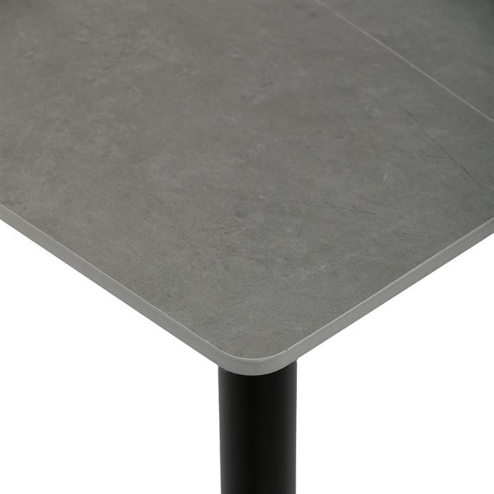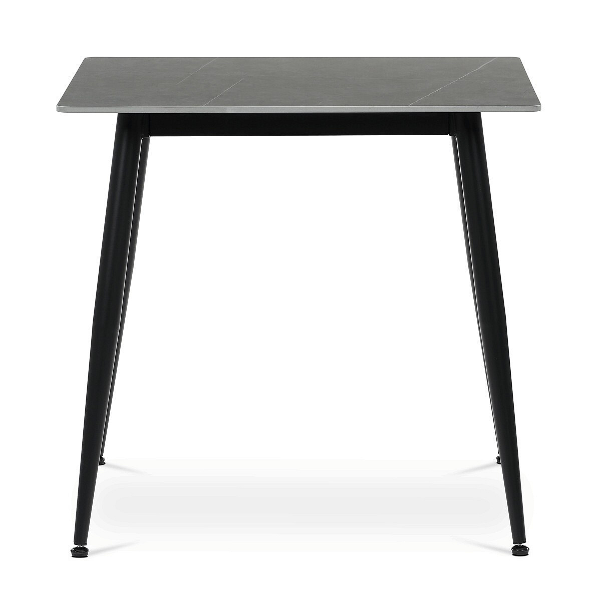 Jídelní stůl o rozměru 80x80 cm s keramickou deskou v šedém mramorovém dekoru nabízí moderní a odolné řešení pro každou jídelnu. Deska je vyrobena z matné keramiky, která je snadno udržovatelná a odolná vůči poškrábání i vysokým teplotám. Stabilní kovové nohy v černém provedení jsou opatřeny rektifikačními patkami, které umožňují vyrovnání nerovností podlahy a zajišťují pevnou oporu. Minimalistický design s tenkou deskou a mírně zkosenými nohami podtrhuje současný styl nábytku. Nosnost stolu odpovídá běžnému užívání v domácnosti i menších provozech.