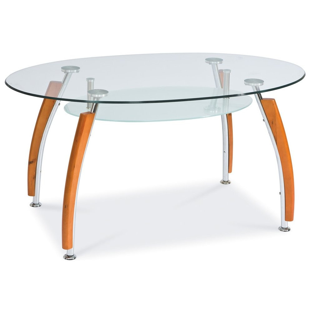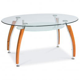 Tento moderní jídelní stůl je má kovovou konstrukci, která je ozdobena dřevěnými lištami v barevném provedení - calvados. Vrchní deska je z průhledného tvrzeného skla a polička je z matného tvrzeného skla. Stůl je určen až pro 6 osob.