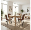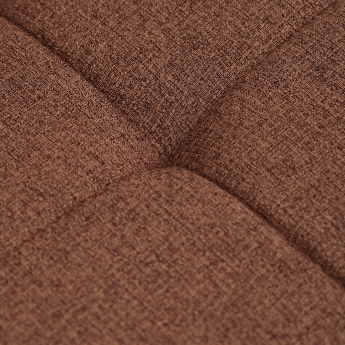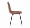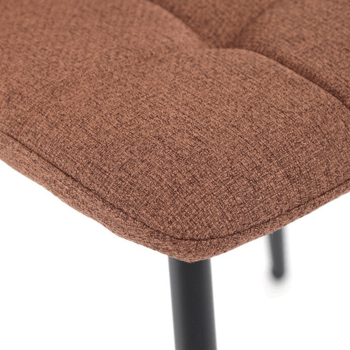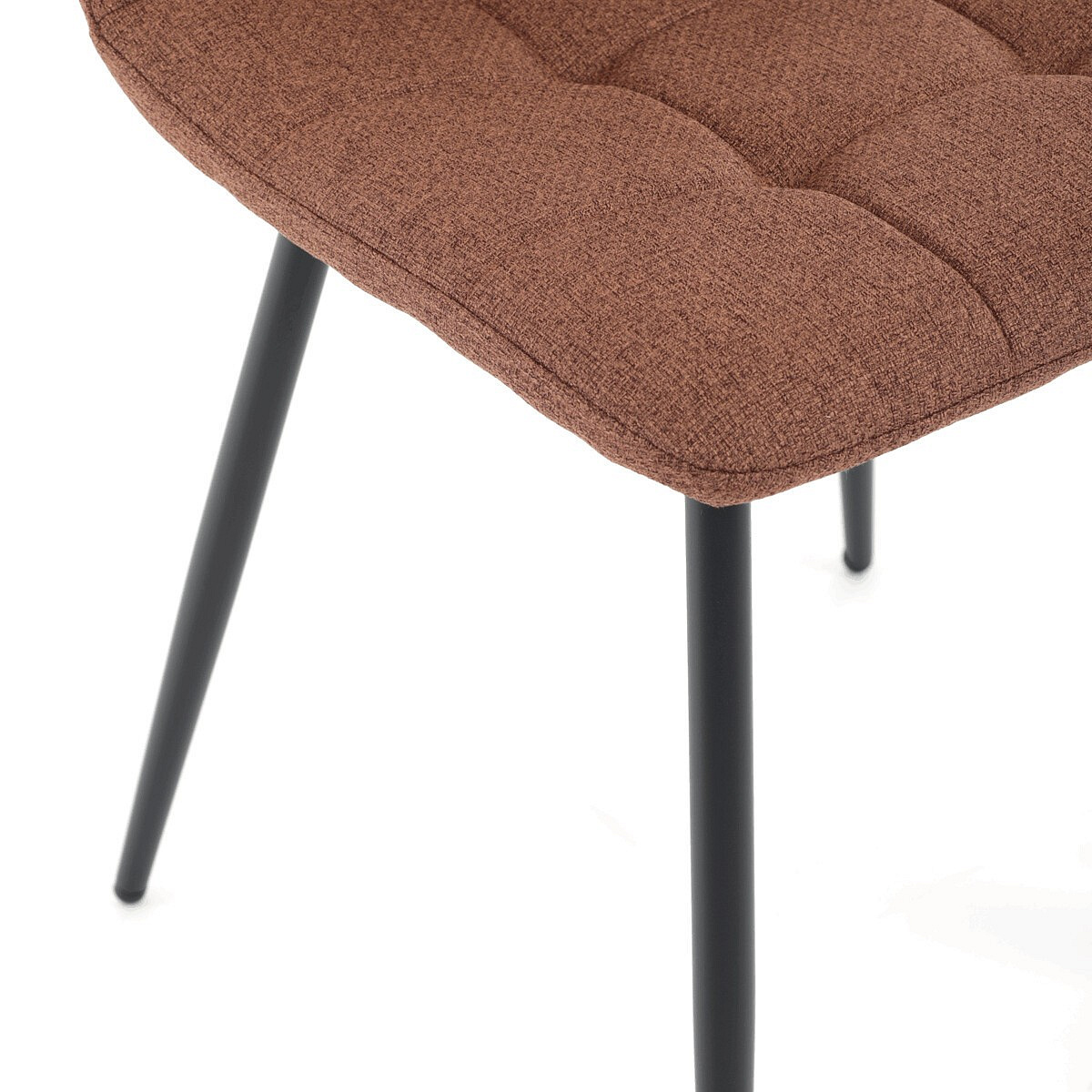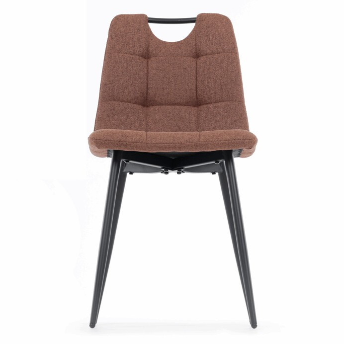 Jídelní židle DCL-V2017 BR2 kombinuje pohodlí s praktickým designem vhodným do moderních interiérů. Sedák a opěradlo jsou potaženy hnědou látkou, která je snadno udržovatelná a doplněná designovým prošitím pro zvýraznění estetického dojmu. Černé matné kovové nohy zajišťují stabilitu a pevnost celé židle, zatímco madlo v horní části opěradla usnadňuje manipulaci a přenášení. Absence područek umožňuje větší variabilitu uspořádání u jídelního stolu. Židle je navržena tak, aby poskytovala komfortní posezení s důrazem na jednoduchou údržbu a dlouhou životnost.