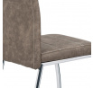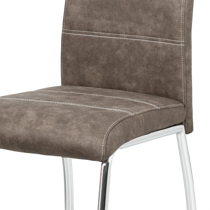 Jídelní židle s potahem z hnědé látky v dekoru vintage kůže s bílým prošitím nabízí stylový vzhled vhodný do moderních i rustikálních interiérů. Sedák a opěradlo jsou čalouněné kvalitní látkou, která kombinuje příjemný dotek s odolností pro každodenní použití. Pevné kovové nohy s chromovaným povrchem zajišťují stabilitu a dlouhou životnost židle. Ergonomicky tvarované opěradlo podporuje pohodlné sezení během jídel i delších posezení. Židle není výškově nastavitelná ani otočná, což podtrhuje její jednoduchý a funkční design.