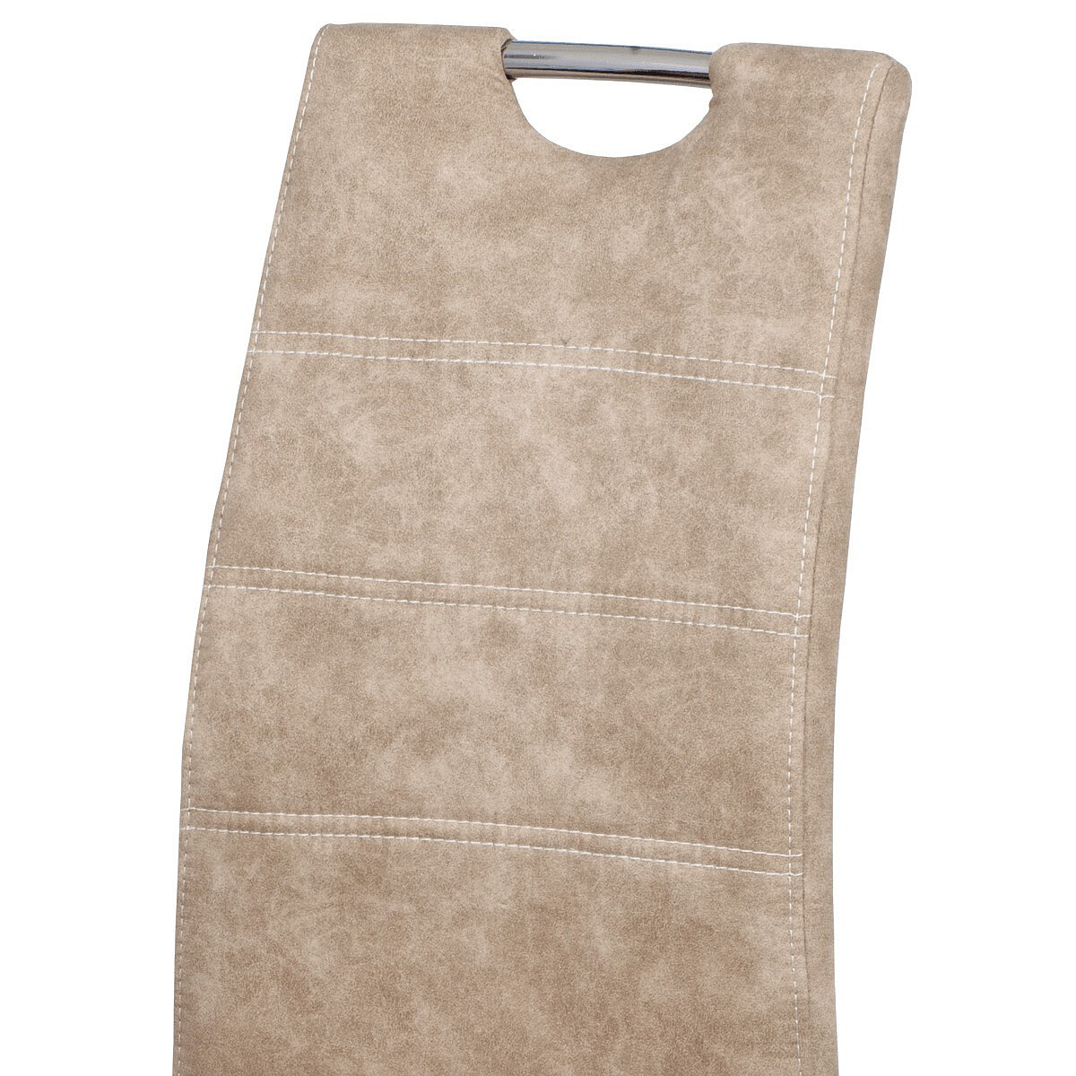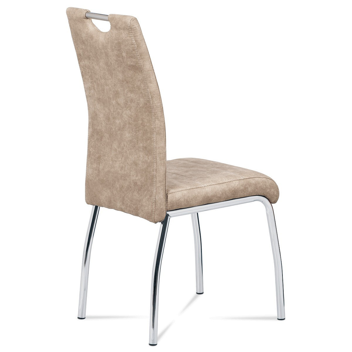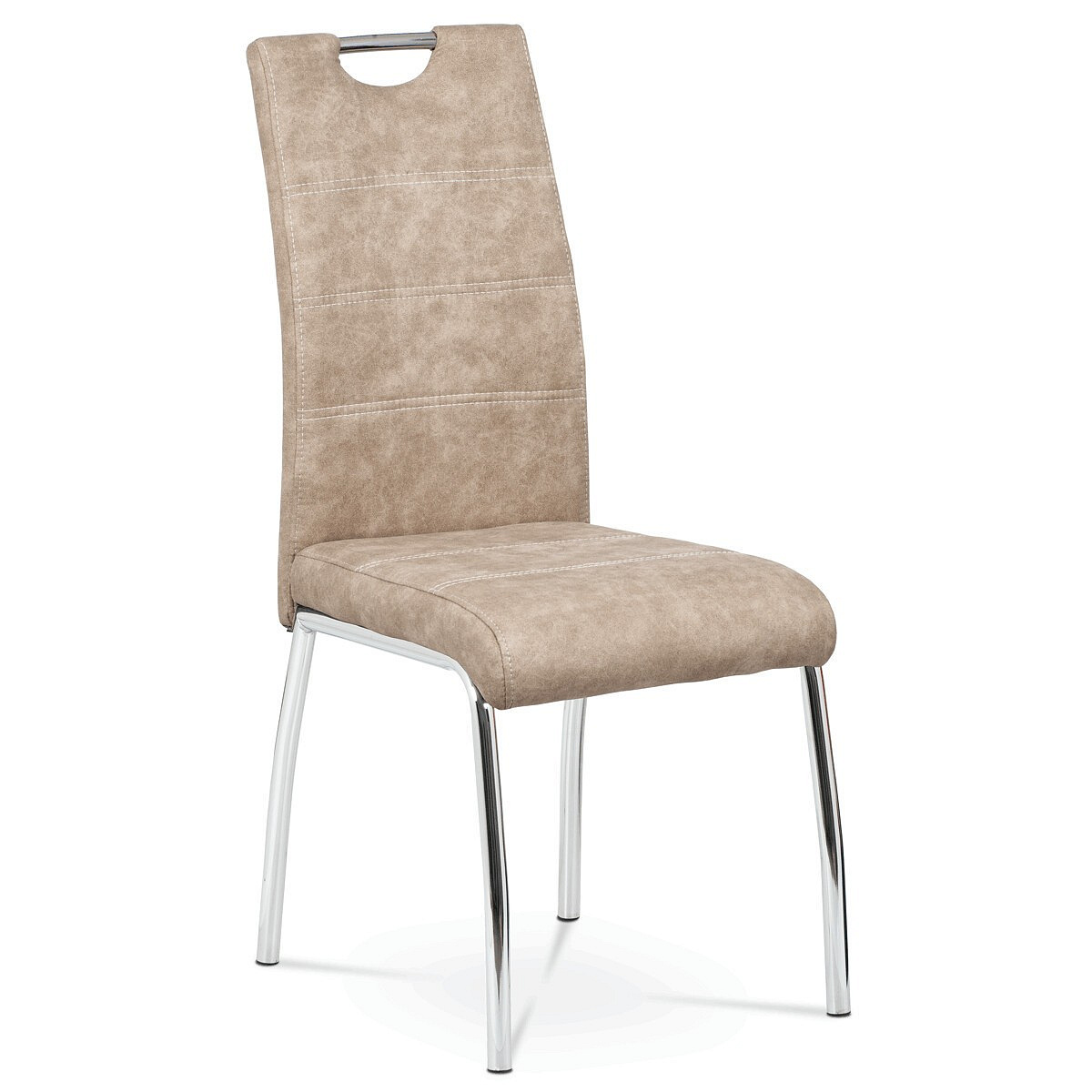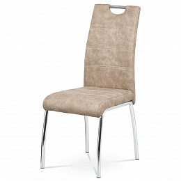 Jídelní židle s potahem z krémové látky v dekoru vintage kůže nabízí příjemný vzhled a pohodlí při sezení. Čalounění je zdobeno bílým prošitím, které podtrhuje stylový design. Pevné kovové nohy s chromovaným povrchem zajišťují stabilitu a dlouhou životnost. Židle nemá područky ani výškové nastavení, což ji činí kompaktní a snadno kombinovatelnou s různými typy jídelních stolů. Praktický otvor v opěradle umožňuje snadnou manipulaci a přenášení.