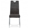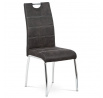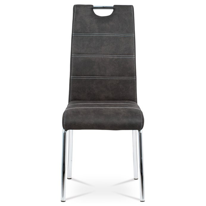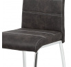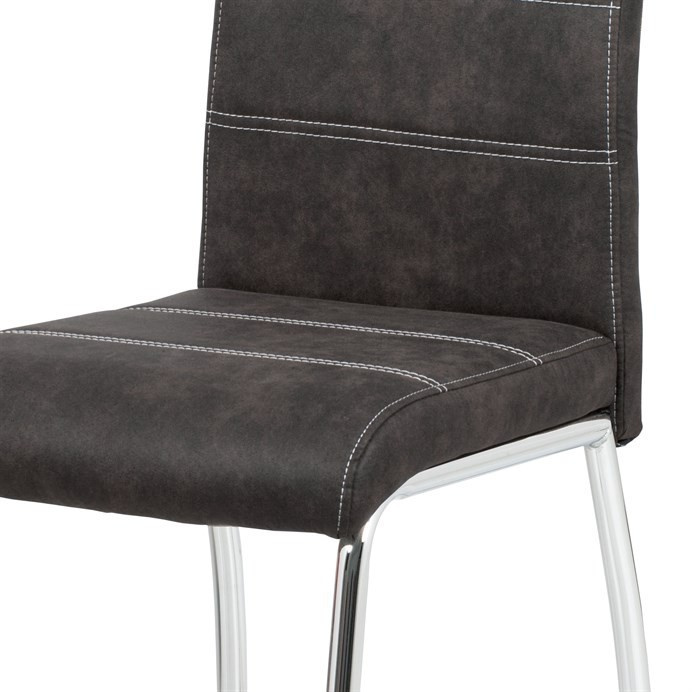 Jídelní židle s označením HC-486 GREY3 nabízí kombinaci moderního designu a praktických detailů. Potah je vyroben z šedé látky v dekoru vintage kůže, doplněný kontrastním bílým prošitím, které zvýrazňuje její elegantní vzhled. Pevná kovová podnož s lesklým chromovým povrchem zajišťuje stabilitu a dlouhou životnost. Opěradlo je ergonomicky tvarované a vybavené madlem pro snadnější manipulaci a přenášení židle. Židle nemá područky ani výškové nastavení, což podporuje její univerzální využití v jídelních prostorách.