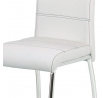 Jídelní židle s potahem z bílé ekokůže je doplněna výrazným černým prošitím, které podtrhuje její moderní design. Čtyřnohá podnož z chromovaného kovu zajišťuje stabilitu a pevnost při sezení. Sedák i opěradlo jsou ergonomicky tvarované a čalouněné pro pohodlné posezení během jídel i delších setkání. Židle nemá područky ani výškové nastavení, což usnadňuje její umístění kolem jídelního stolu a šetří prostor. Povrch ekokůže se snadno udržuje a je navržen pro dlouhou životnost.