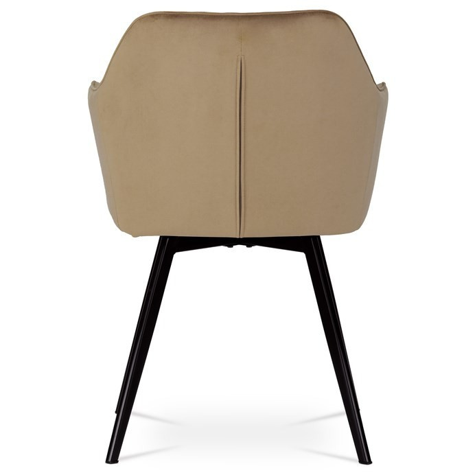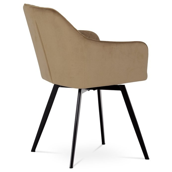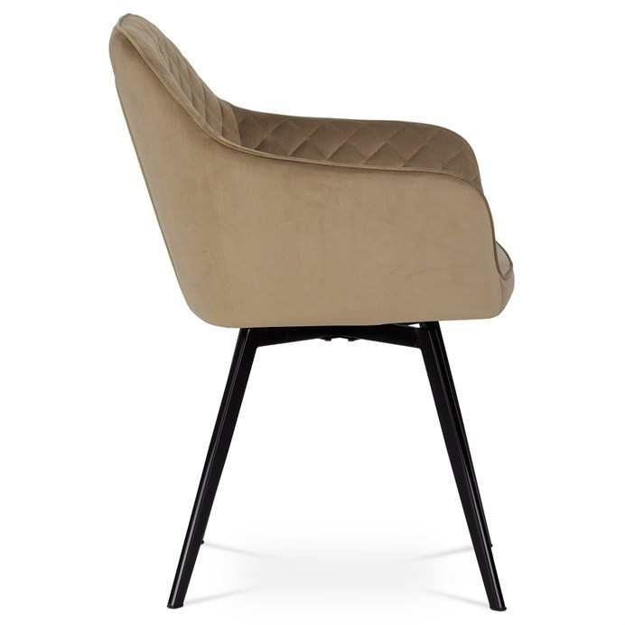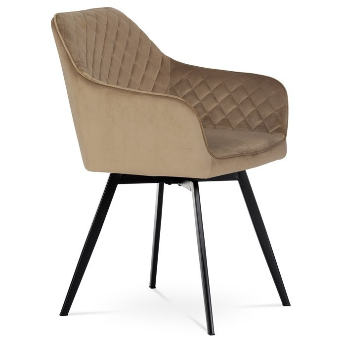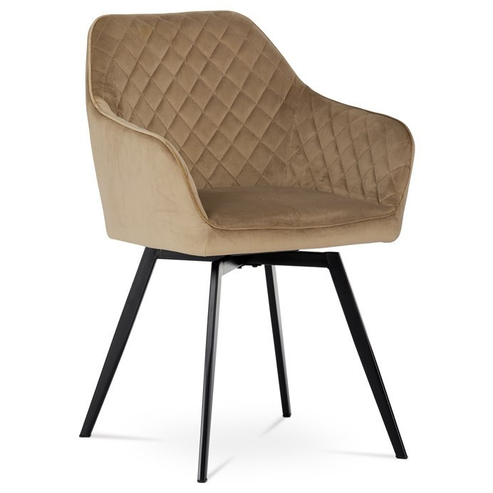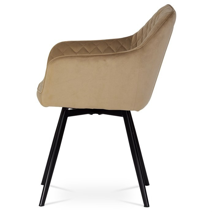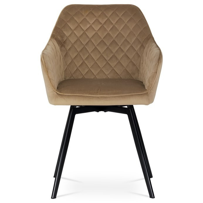 Díky svému dokonalému designu je tato židle v industriálním stylu nezaměnitelná a zároveň velmi pohodlná. Skořepina sedáku a opěradla má potah z kvalitní sametové látky v trendy odstínu zlaté cappuccino v matné úpravě. Polstrování je z PU pěny. Velmi dekorativním prvkem je výrazné kosočtvercové prošití vnitřních ploch v barvě potahu a paspule po obvodu celé skořepiny. Vybraná látka se také velmi dobře čistí. Stabilitu židle zajišťují čtyři kónické kovové nohy obdélníkového průřezu s kvalitním práškovým nástřikem v černé matné barvě. Ukončené jsou černými plastovými kluzáky, zabraňující poškození tvrdých povrchů podlah. Tato provedení produkují z tohoto modelu židle skvělou volbu pro zařízení obývacích či jídelních, ale také zasedacích místností. Nosnost židle je 110 kg. Bonusem této židle je otočný a vratným mechanismus, který umožňuje otáčení o 90° doleva a o 90° doprava a zároveň vždy vrátí sedák do původní polohy. Díky němu žiidle zůstanou vždy srovnané u stolu.