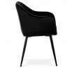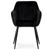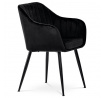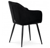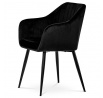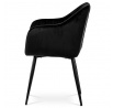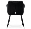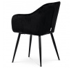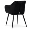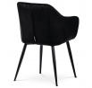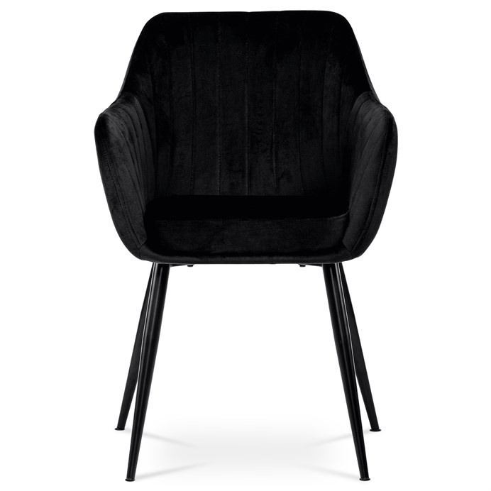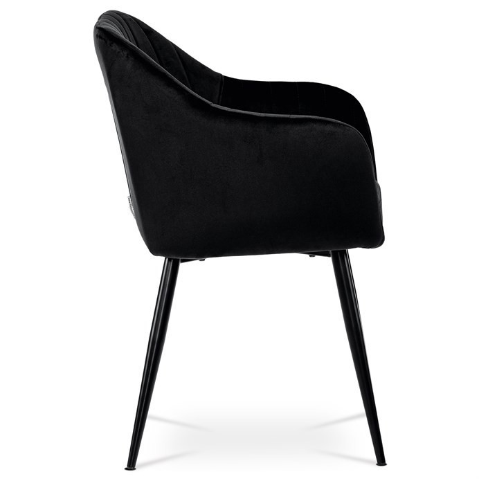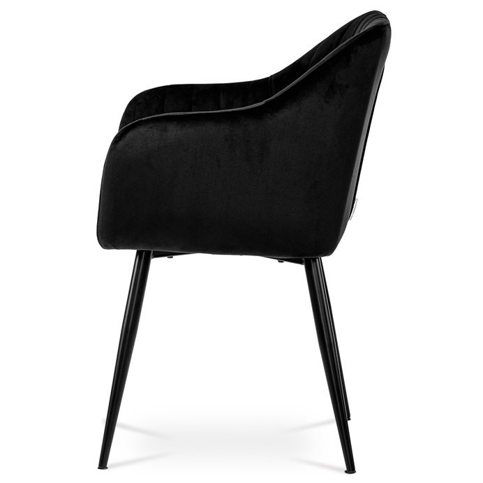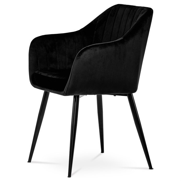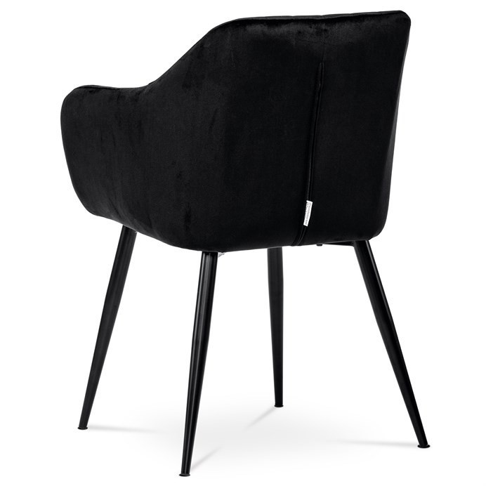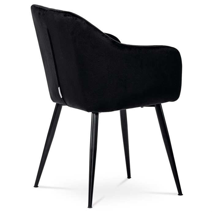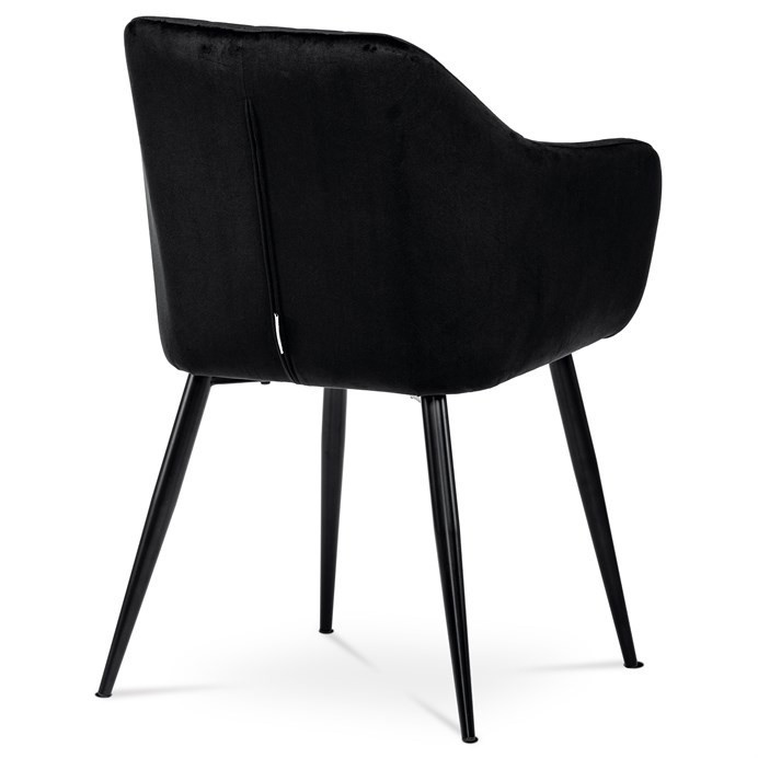 Dokonalý design, industriální styl a perfektní pohodlí je pro tuto židli samozřejmostí. Skořepina sedáku i opěradla má pevnou kovovou kostru, potah z velmi kvalitní sametové látky v matném provedení a nadčasovém a luxusním odstínu černé. Polstrování je z PU pěny. Bonusem ke zvýšení pohodlí posedu je 8 cm zvýšený a extra polstrovaný sedák a praktické pohodlné opěrky s opěrnou plochou ve výšce 69 cm od podlahy. Příjemný dekorativní prvek vytvářejí svislá prošití vnitřních částí opěradla i boků. Použitá látka je velmi odolná a perfektně se čistí. Stabilitu židle zajišťují čtyři kónické kovové nohy s kvalitním práškovým nástřikem v černé matné barvě. Ukončené jsou černými plastovými kluzáky, zabraňující poškození tvrdých povrchů podlah. Nohy mají kruhový průřez o průměru od 2 do 3,5 cm v horní části. Všechna tato plus produkují z tohoto modelu skvělou volbu pro Váš výběr zařízení jídelních a nebo obývacích prostor, ale skvěle se hodí i jako konferenční židle do zasedacích místností. Nosnost židle je až 120 kg. Základní rozměry jsou – celková šíře 58 cm, celková hloubka 57 cm, celková výška 84 cm, výška sedu 52 cm a hloubka sedu 43 cm.