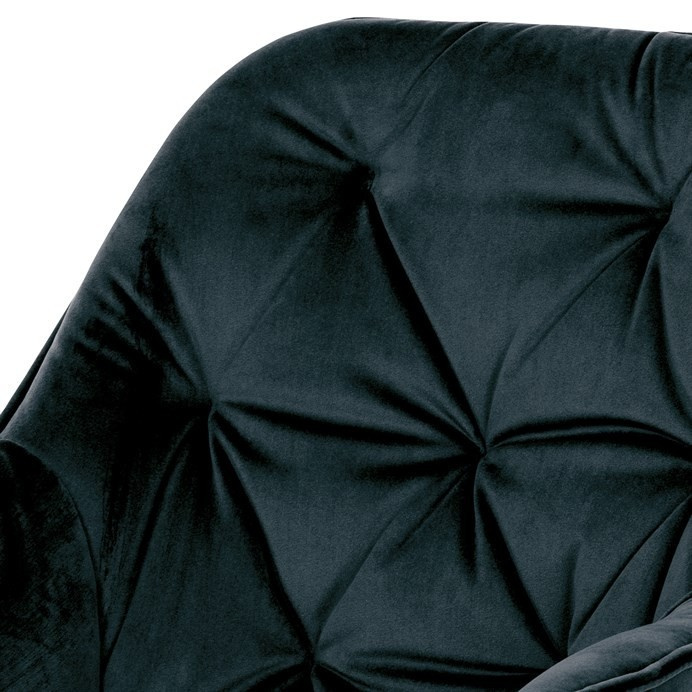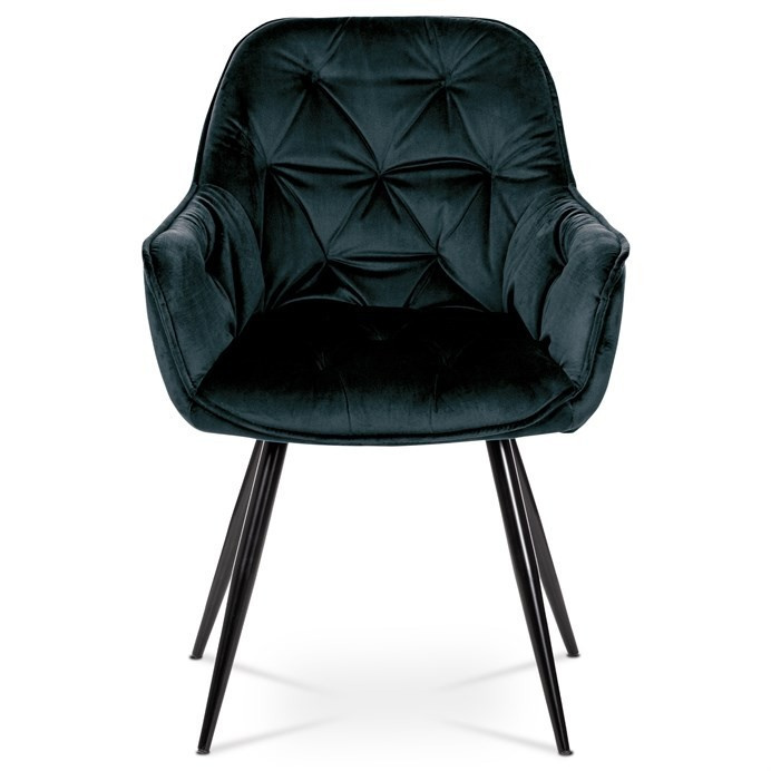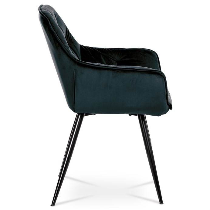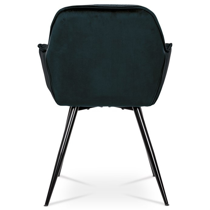 Jídelní židle s označením DCH-421 BK4 nabízí komfortní sezení díky čalounění z modročerné sametové látky, která je příjemná na dotek a snadno se udržuje. Pevná kovová čtyřnohá podnož s černým lakem zajišťuje stabilitu a dlouhou životnost. Designové prošití na opěradle a sedáku podtrhuje moderní vzhled židle, zatímco integrované područky přispívají k pohodlí při delším posezení. Židle není otočná, což podporuje pevnou a stabilní pozici při stolování. Vhodná je zejména do jídelních prostor, kde kombinuje estetiku s funkčností.