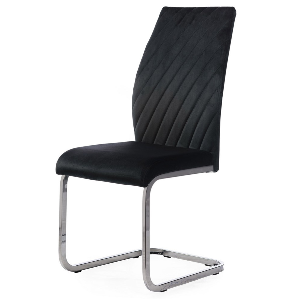 Jídelní židle v moderním stylu. Potažena je černou sametovou látkou s šikmým prošitím opěráku. Kovová pohupová chromovaná podnož obdélníkového průřezu. Ve spodní části je osazena plastovými kluzáky, eliminujícími poškození povrchu tvrdých podlah. Nosnost židle je 110 kg.