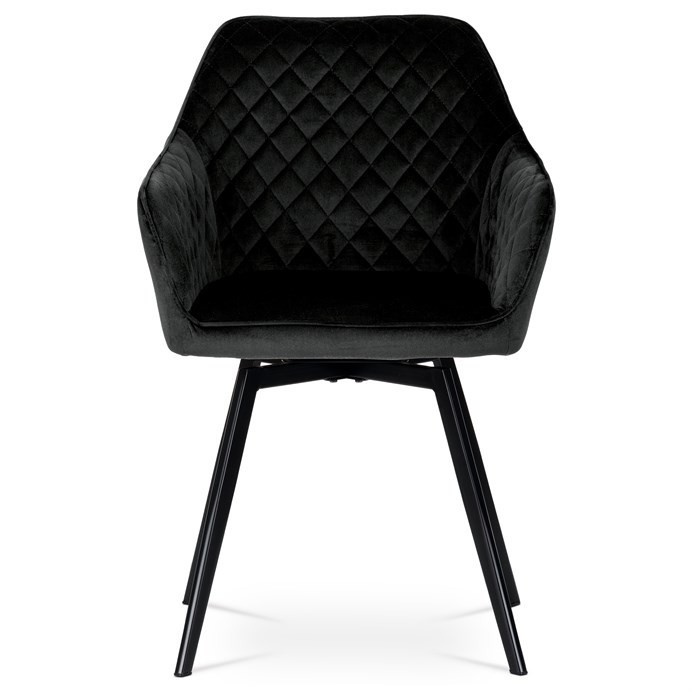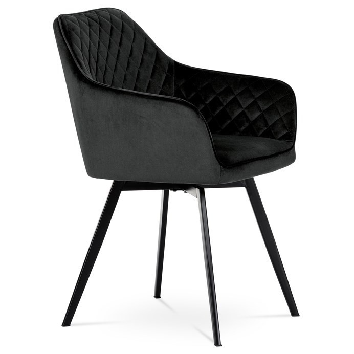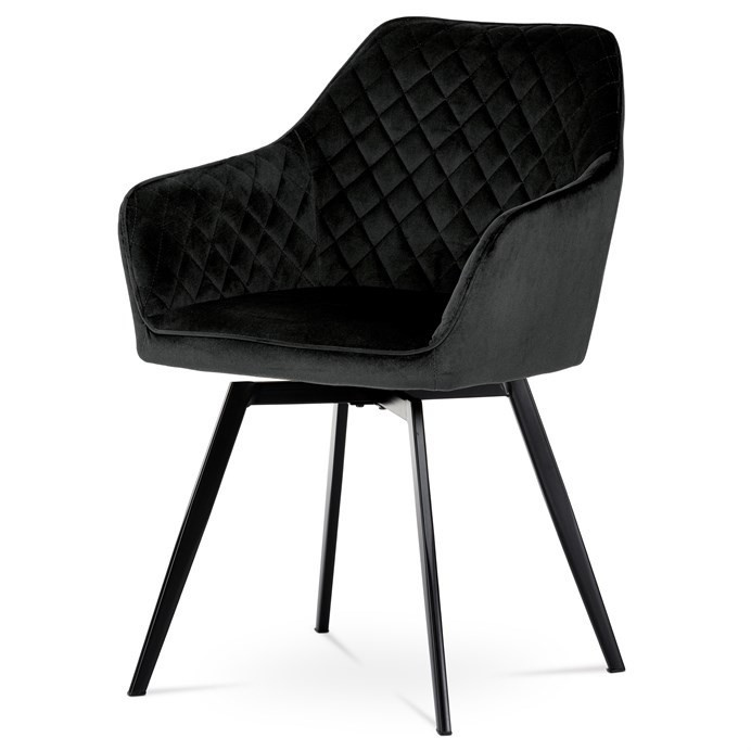 Díky svému dokonalému designu je tato židle v industriálním stylu nezaměnitelná a zároveň velmi pohodlná. Skořepina sedáku a opěradla má potah z kvalitní látky ve vesmírně černém matném sametu. Polstrování je z PU pěny. Velmi dekorativním prvkem je výrazné kosočtvercové prošití vnitřních ploch v barvě potahu a paspule po obvodu celé skořepiny. Vybraná látka se také velmi dobře čistí. Stabilitu židle zajišťují čtyři kónické kovové nohy obdélníkového průřezu s kvalitním práškovým nástřikem v černé matné barvě. Ukončené jsou černými plastovými kluzáky, zabraňující poškození tvrdých povrchů podlah. Tato provedení produkují z tohoto modelu židle skvělou volbu pro zařízení obývacích či jídelních, ale také zasedacích místností. Nosnost židle je 110 kg. Bonusem této židle je otočný a vratným mechanismus, který umožňuje otáčení o 90° doleva a o 90° doprava a zároveň vždy vrátí sedák do původní polohy. Díky němu žiidle zůstanou vždy srovnané u stolu.