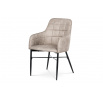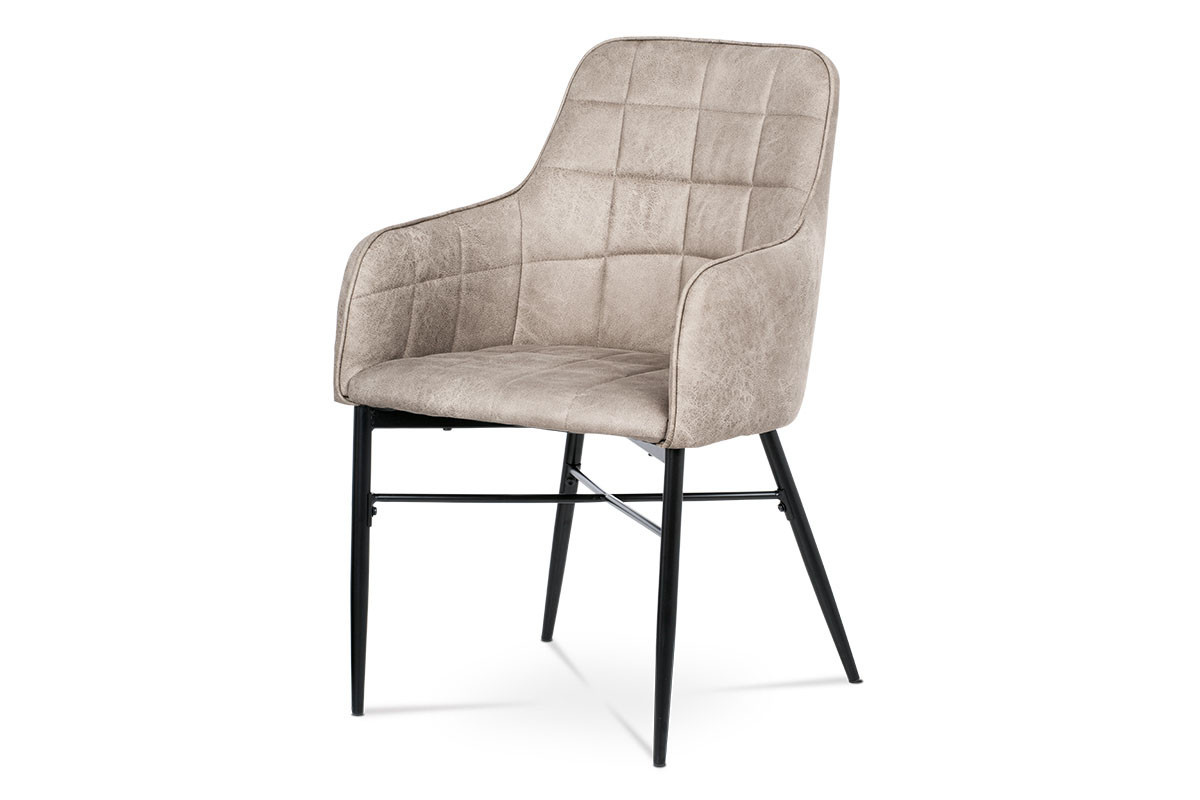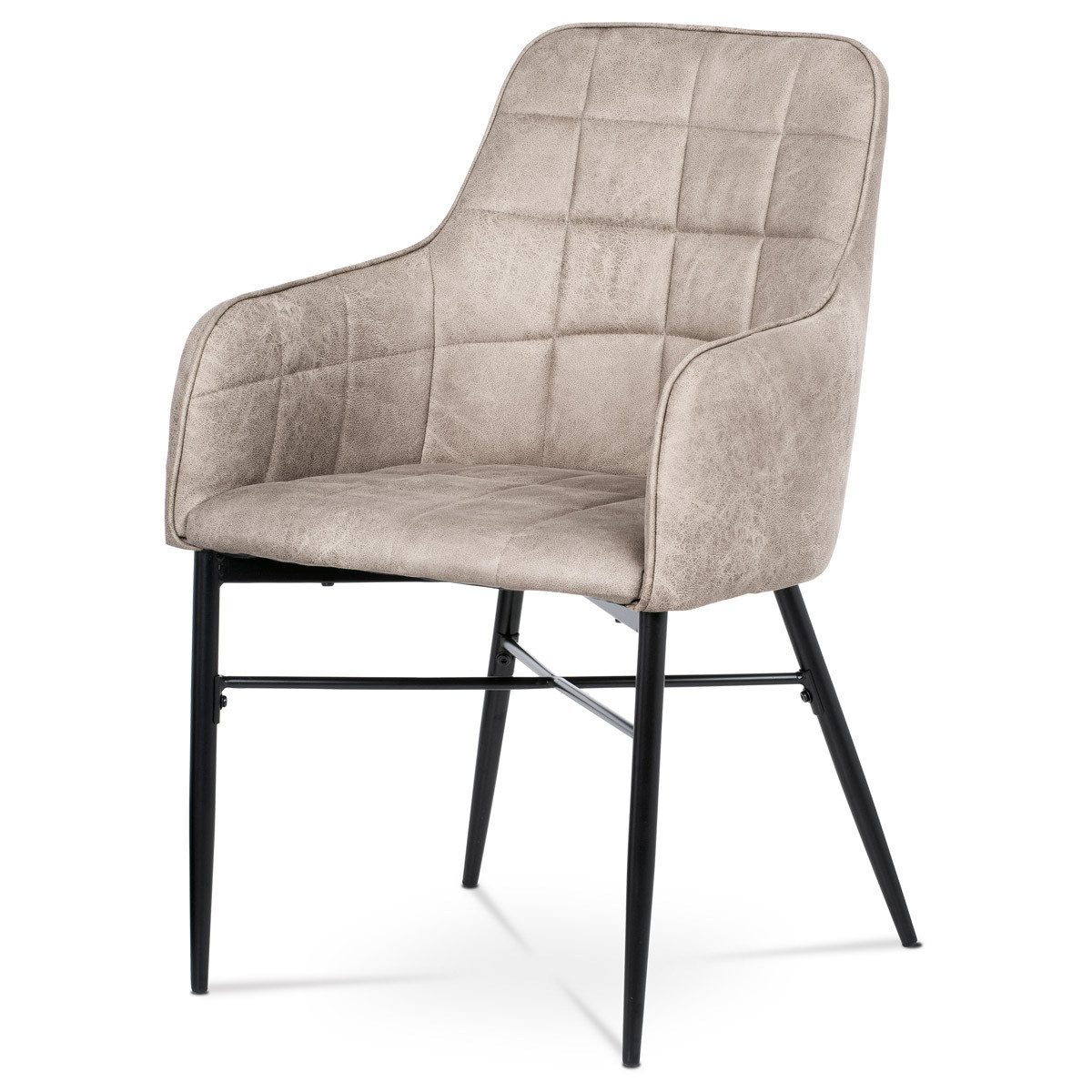Designově tvarovaná jídelní židle v industriálním stylu se zvýšenými bok, plynule přecházející do vyššího opěráku. Potah je z trendy lanýžové látky v dekoru vintage kůže s výrazným čtvrecovým prošitím prošitím opěráku i sedáku. Polstrování je z kvalitní PU pěny. Industriální vzhled podtrhuje kovová čtyřnohá podnož lakovaná černou matnou práškovou barvou, zpevněná trubkovým křížem. Nohy jsou kulatého průřezu a opatřeny černými plastovými kluzáky, které snižují riziko poškození Vaší podlahy na minimum. Nosnost židle je až 110 kg. Svým provedením a nadčasovou a seriózní barevností perfektně zapadne do industriálně zařízené místnosti. Ergonomicky tvarovaný sedák i opěrák slibuje příjemné a pohodlné posezení a zvýšené boky i odpočinek pro vaše ruce.
