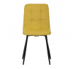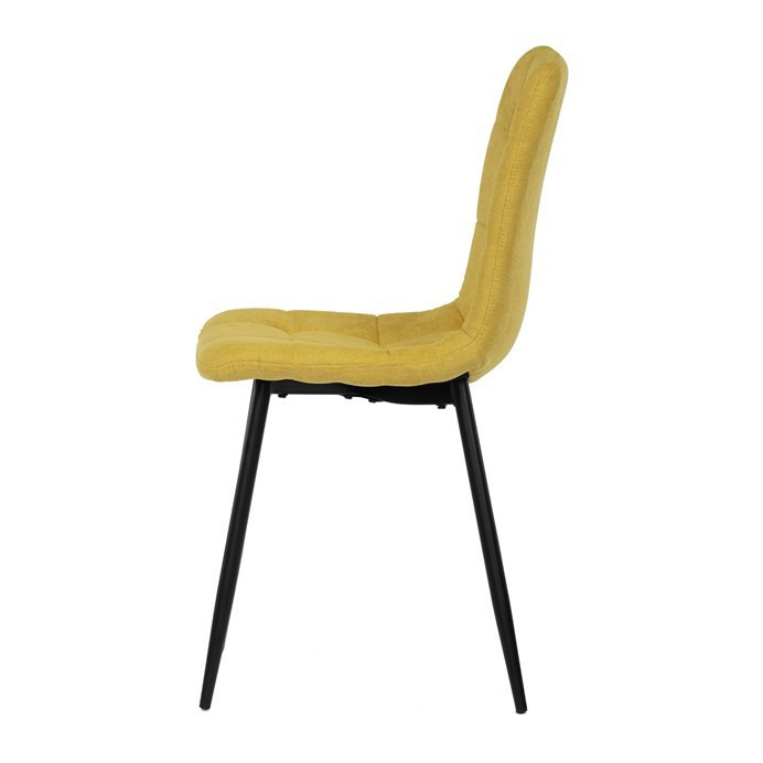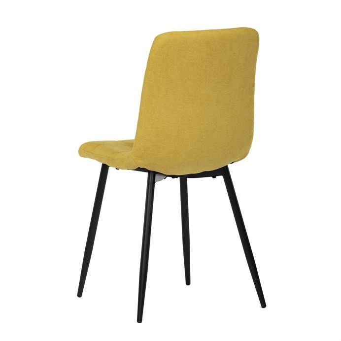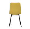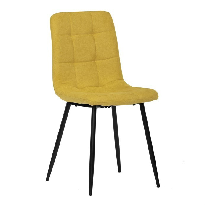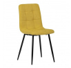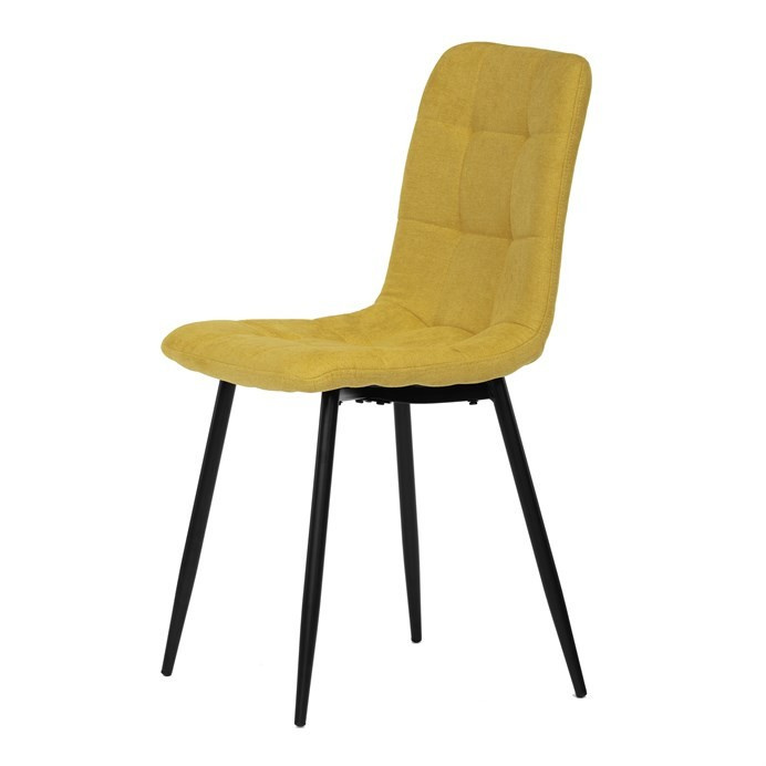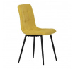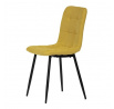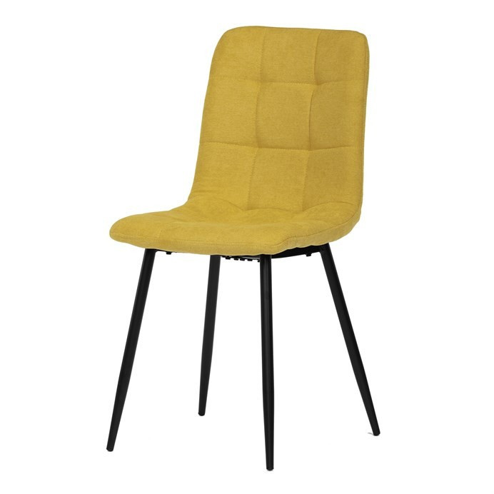 Jídelní židle v industriálním stylu. Potah je z hladké látky ve velmi žádané hořčicově žluté barvě. Výrazné je čtvercové prošití čelních ploch sedáku i opěradla. Polstrování je z kvalitní PU pěny. Stabilitu židle zajišťují čtyři kónické kovové nohy s kvalitním práškovým nástřikem v černé matné barvě. Ukončené jsou černými plastovými kluzáky, zabraňujícími poškození tvrdých povrchů podlah. Nohy jsou kruhového průřezu o nejvyšším průměru 3 cm. Tento minimalistický design jídelních židlí je velmi oblíben pro svoji nadčasovost i pohodlí, které poskytuje. Můžete ji bez obav použít k široké škále stolů v různých materiálech i provedeních.