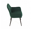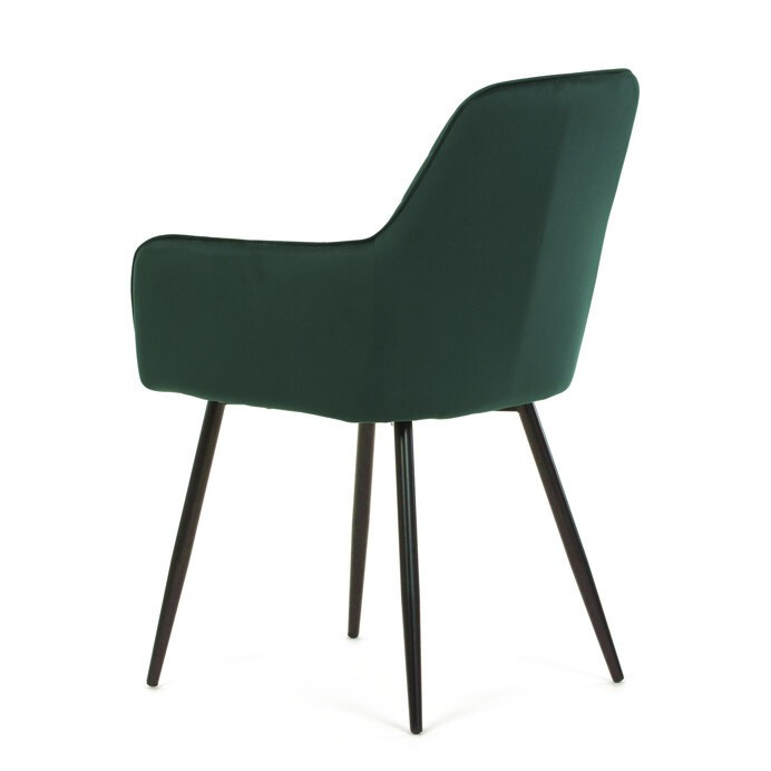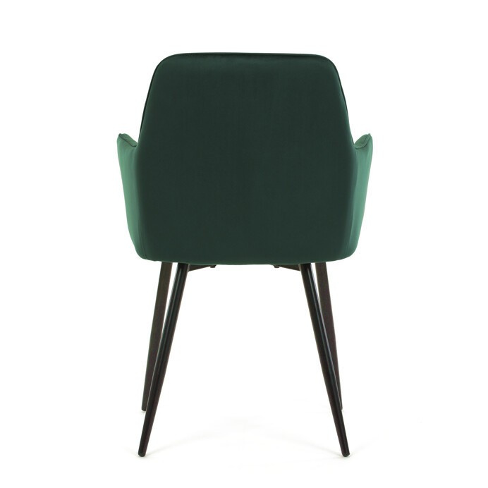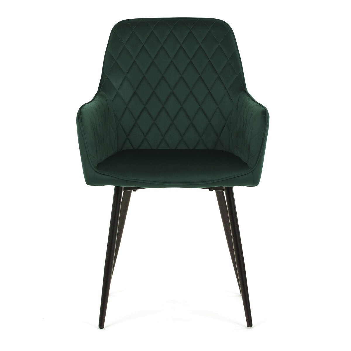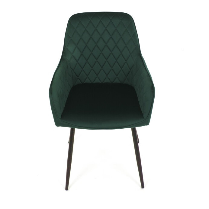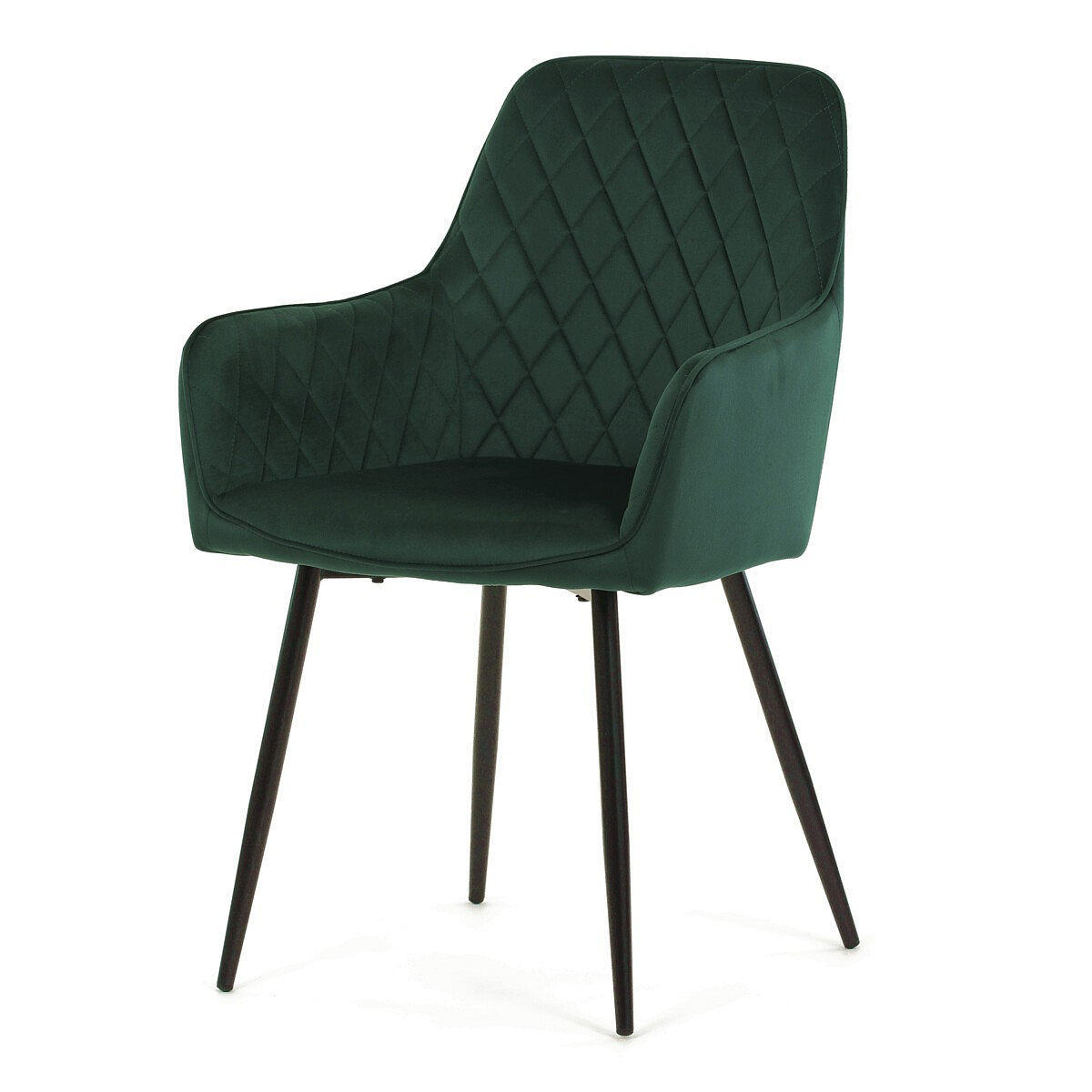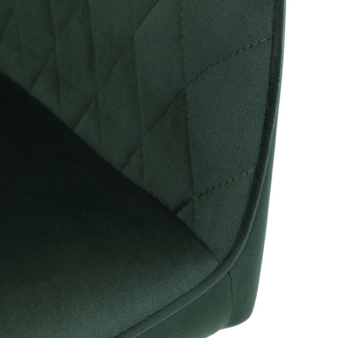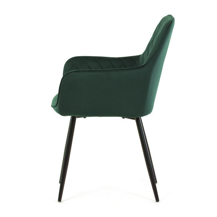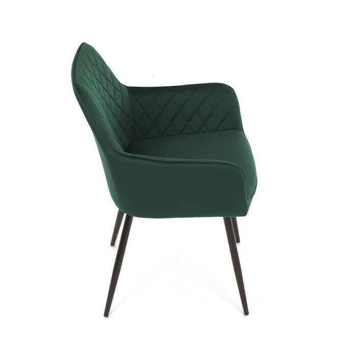Jídelní židle s označením DCH-215 GRN4 nabízí pohodlné sezení díky čalounění z kvalitní zelené sametové látky, která je příjemná na dotek a snadno se udržuje. Opěradlo i sedák jsou doplněny designovým prošitím v kosočtverečném vzoru, které podtrhuje moderní vzhled židle. Pevné černé kovové nohy zajišťují stabilitu a dlouhou životnost, zatímco integrované područky přispívají k vyššímu komfortu při sezení. Židle je určena pro použití v jídelnách, kuchyních či kavárnách, kde kombinuje estetiku s funkčností.