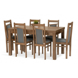 Jídelní sestava Magnum 6 se skládá z rozkládacího stolu a šesti židlí. Tato jídelní sestava splní svůj účel na výbornou nejen v kuchyni, ale i v jídelně, nebo obývacím pokoji s jídelním koutem. Svou vysokou kvalitou a precizním zpracováním, uspokojí všechny budoucí, i ty velmi náročné, uživatele. Nohy stolu a kostry židlí jsou vyrobeny z bukového dřeva, mořeného tak, aby ladily s deskou stolu, která je vyrobená z lamina v dekoru dub lefkas. Jídelní sestava je dodávaná v demontu. Součástí balení je schématický montážní návod, včetně všech potřebných spojovacích prvků. Cena je uvedena za jídelní stůl a 6 židlí. Vlivem nastavení monitorů, nebo displejů telefonů, se zobrazení barev na fotograii může od skutečnosti lišit. Úvodní fotografie je ilustrační. Židle budou dodány v zelené barvě.