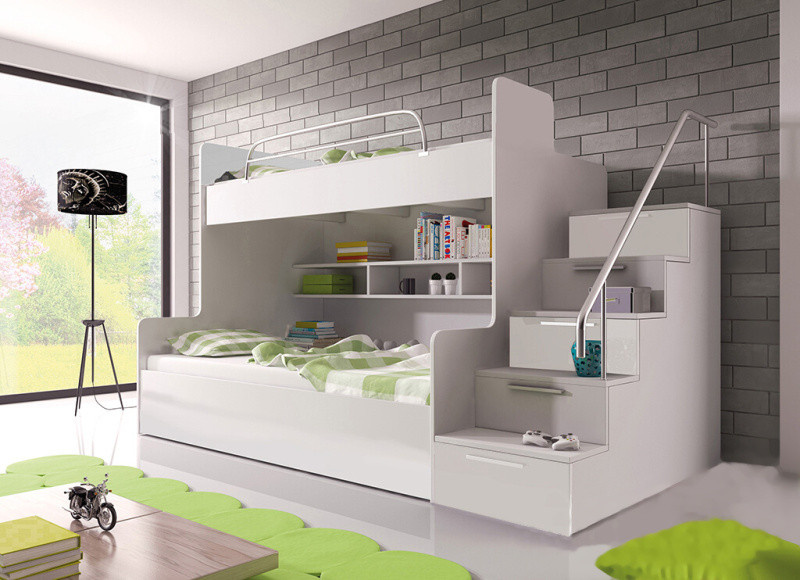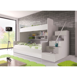 Tato patrová postel je určená především pro osoby, které ocení moderní design, funkčnost a spoustu úložných prostorů. Patentované provedení a stabilní konstrukce postele Vám zaručuje bezpečí pro Vaše děti. Schody v sobě ukrývají spoustu úložného prostoru. Barevné provedení dvířek je v lesku a schůdky lze objednat jak na pravou tak i levou stranu (stranu schodů určujeme z čelního pohledu). Nosnost každého lůžka je 100 kg, nosnost schodu je 55 kg. Pod spodním lůžkem je šuplík na lůžkoviny nebo hračky. Vedle spodního lůžka je ukryt úložný prostor po celé délce postele (viz. detail montážního plánku). K této posteli je možnost dokoupit další nábytek a utvořit tak krásný dětský pokoj. Uvedená úvodní fotografie je v pravém provedení.