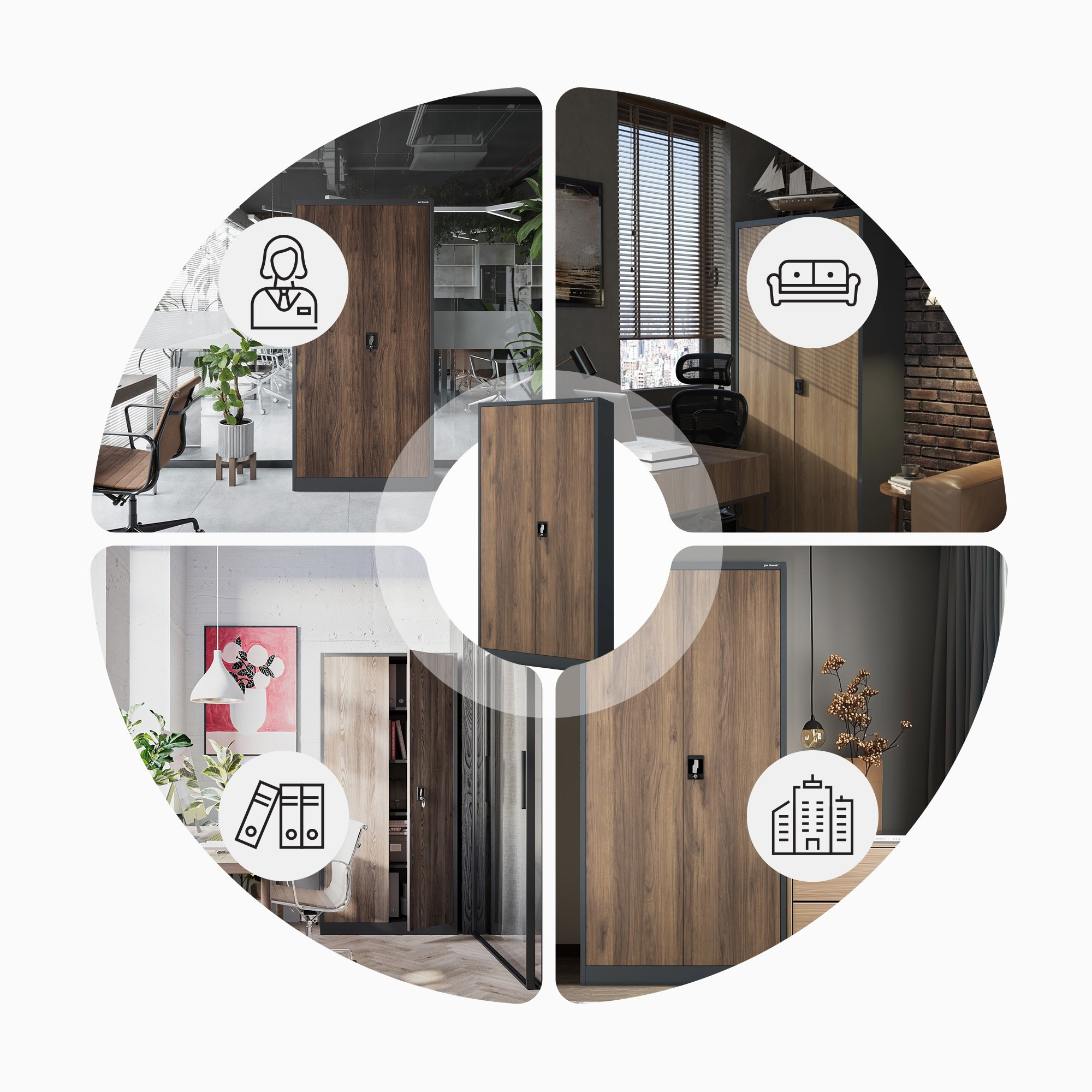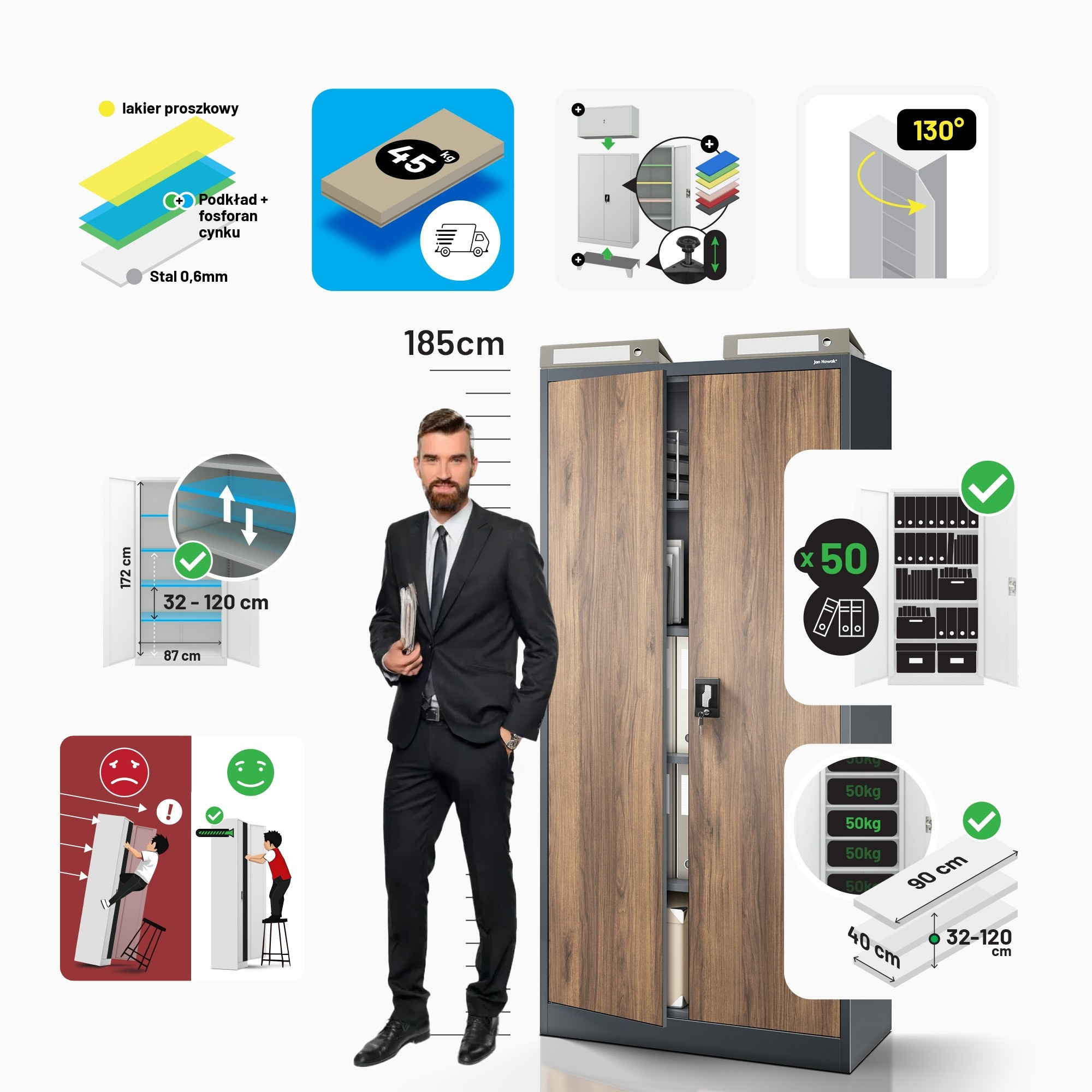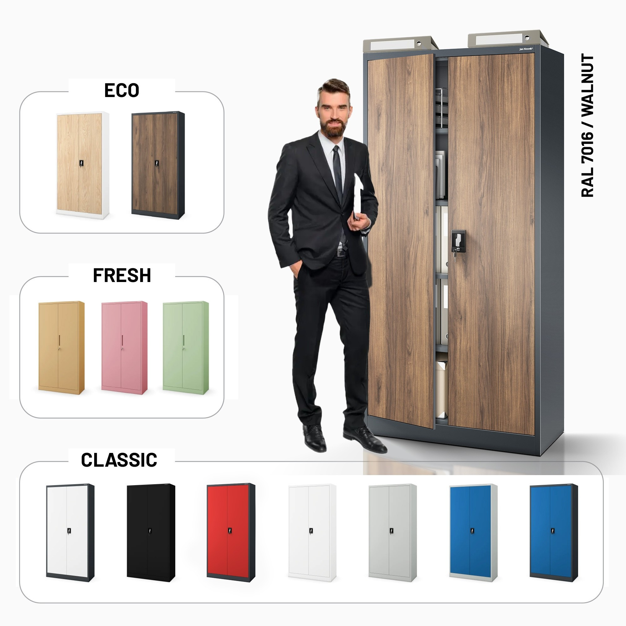 Zapomeňte na nudné a nevzhledné kovové skříně. Skříň JAN z řady Eco Design přináší do vašeho interiéru nádech elegance a sofistikovanosti. Speciální povrchová úprava v barvě antracit (RAL 7016) s dekorem ořechového dřeva dodává skříni luxusní vzhled, který se hodí do moderních i klasických interiérů.