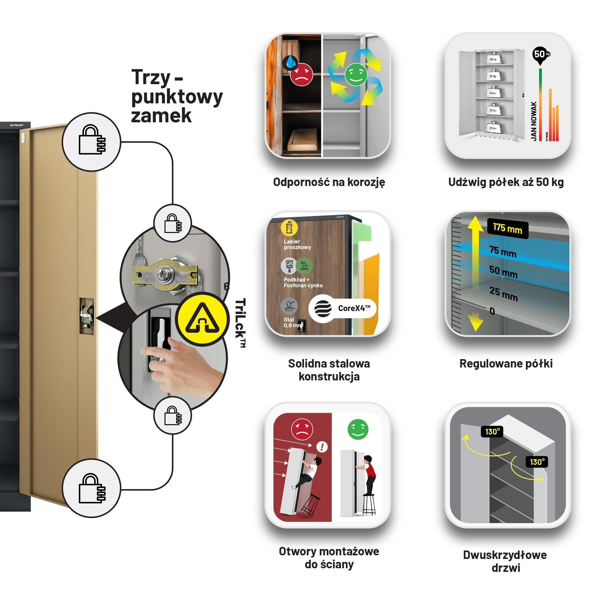 Skříň JAN je vyrobena z kvalitní oceli o tloušťce 0,6 mm, která je ošetřena práškovým lakováním. Tato povrchová úprava zajišťuje vysokou odolnost proti mechanickému poškození, korozi a opotřebení. Skříň JAN vám tak bude sloužit dlouhá léta bez ztráty kvality a vzhledu.