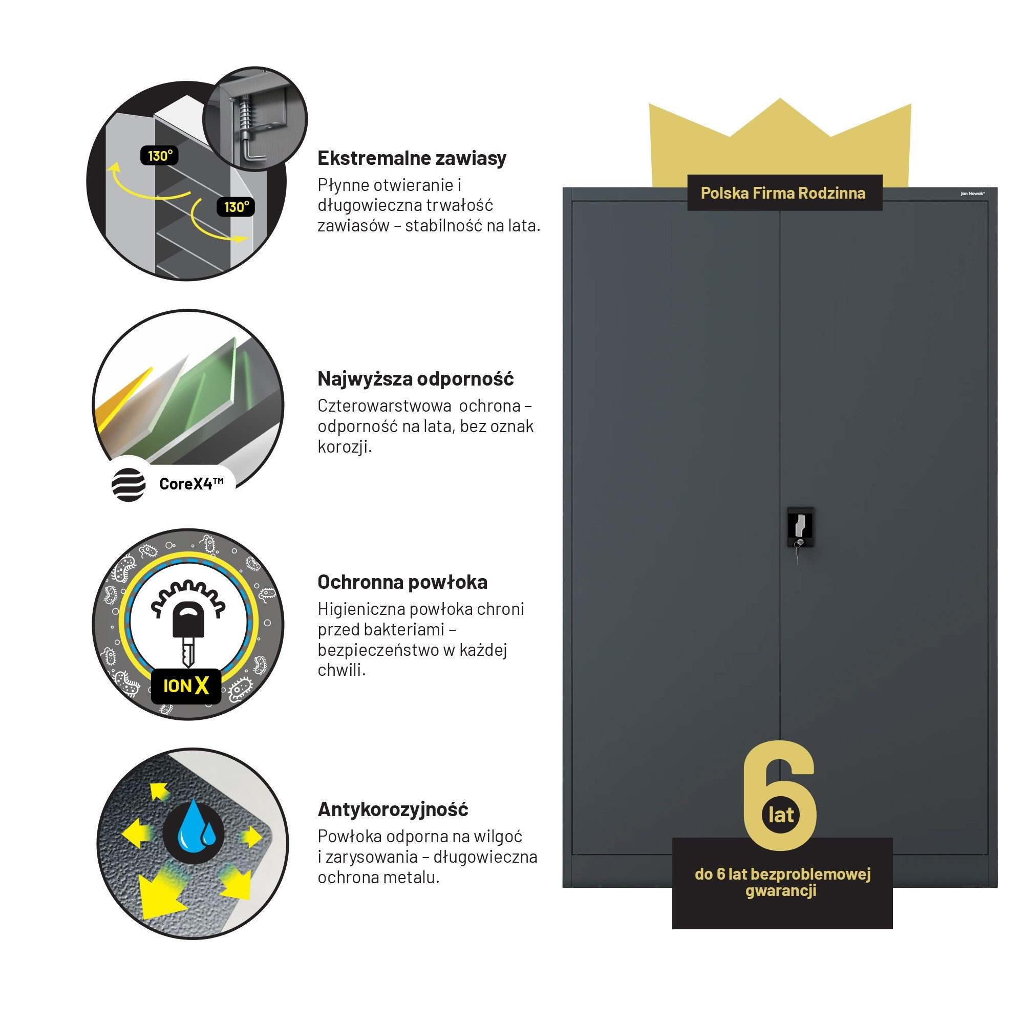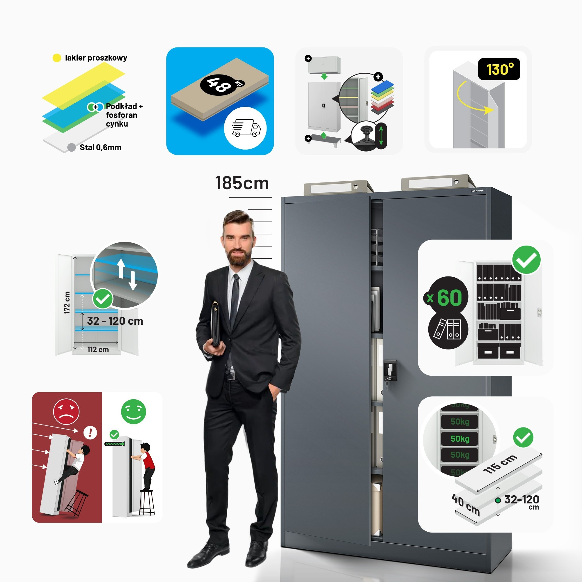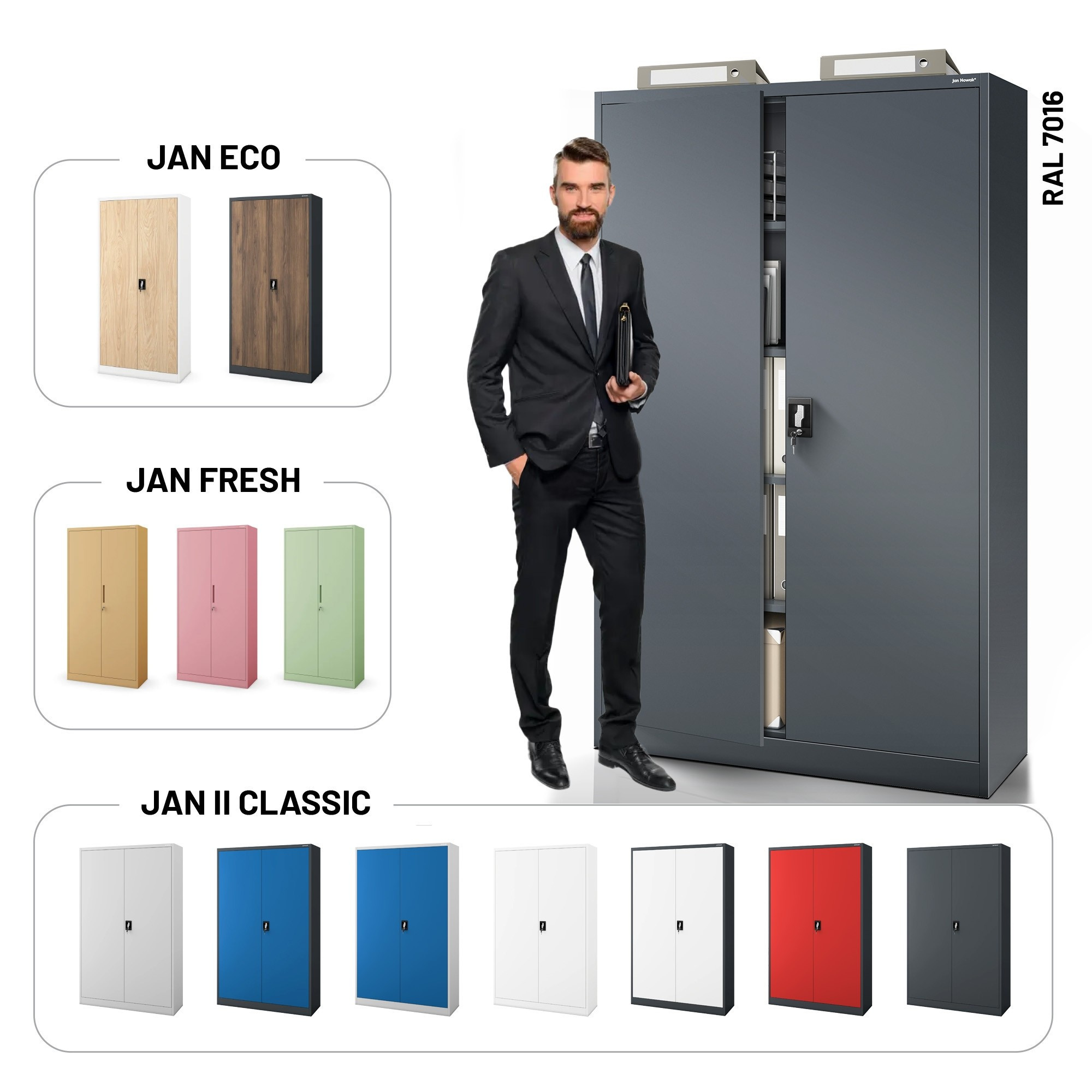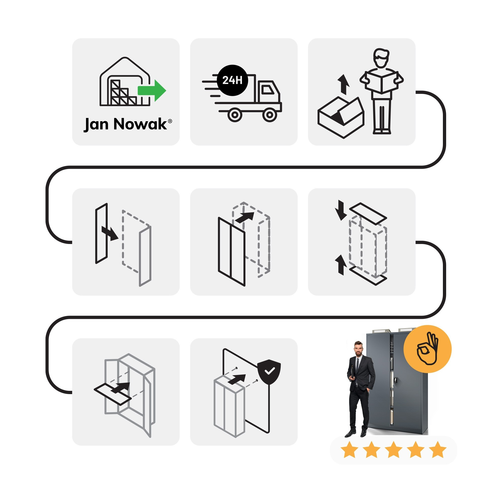 Skříň JAN II je součástí kolekce JAN NOWAK, která je známá svým kvalitním a funkčním kovovým nábytkem. Jako jeden z největších dodavatelů kovových skříní v Evropě zaručujeme vysokou kvalitu produktů a služeb. Naším cílem je vždy překračovat tržní standardy a nabízet zákazníkům to nejlepší.